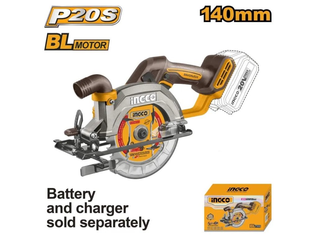 Akumulátorová kotoučová pila, napětí 20V, bezkomutátorový motor, otáčky 6300 ot./min, rozměr kotouče 140 x (1,2-2,8) x 20 mm.