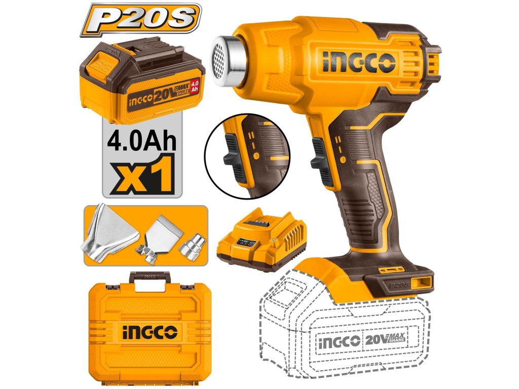 Ingco HGLI20025 AKU horkovzdušná pistole vč. baterie a nabíječky