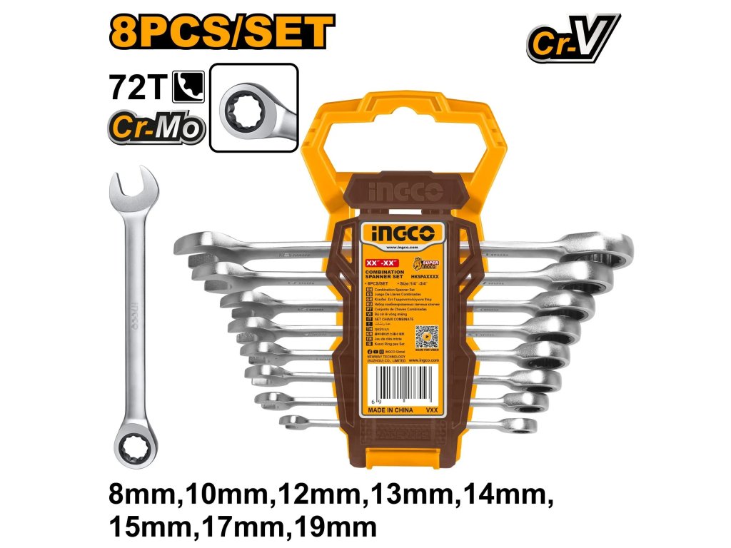 Ingco HKSPAR1082 Klíč očkoplochý račnový CrMo 8-19mm 8ks