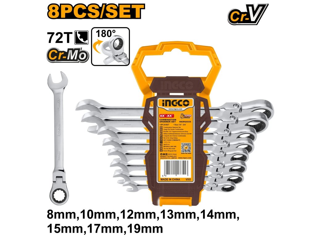 Ingco HKSPAR1083 Klíč očkoplochý račnový CrMo 8-19mm 8ks, CrV
