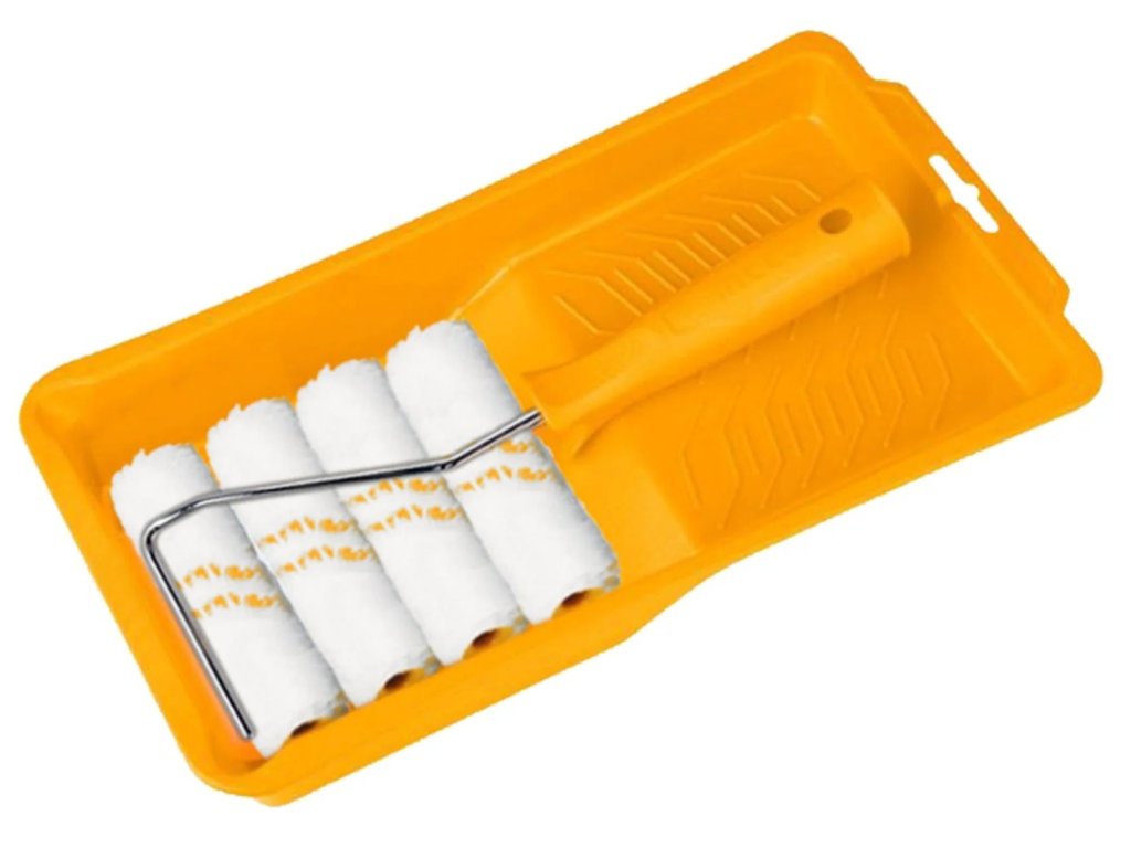 Váleček malířský 4" 100 mm sada 6v1, vhodné pro vnitřní stěnu a hladký povrch, středová stopka 6 mm, obsahuje 4 ks válečků z polyesterové pěny, 1 ks držák válečku, 1 ks zásobník na barvu