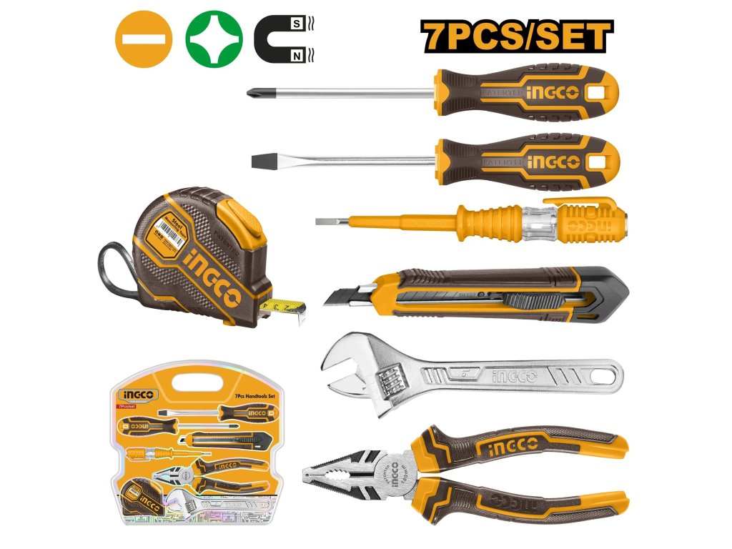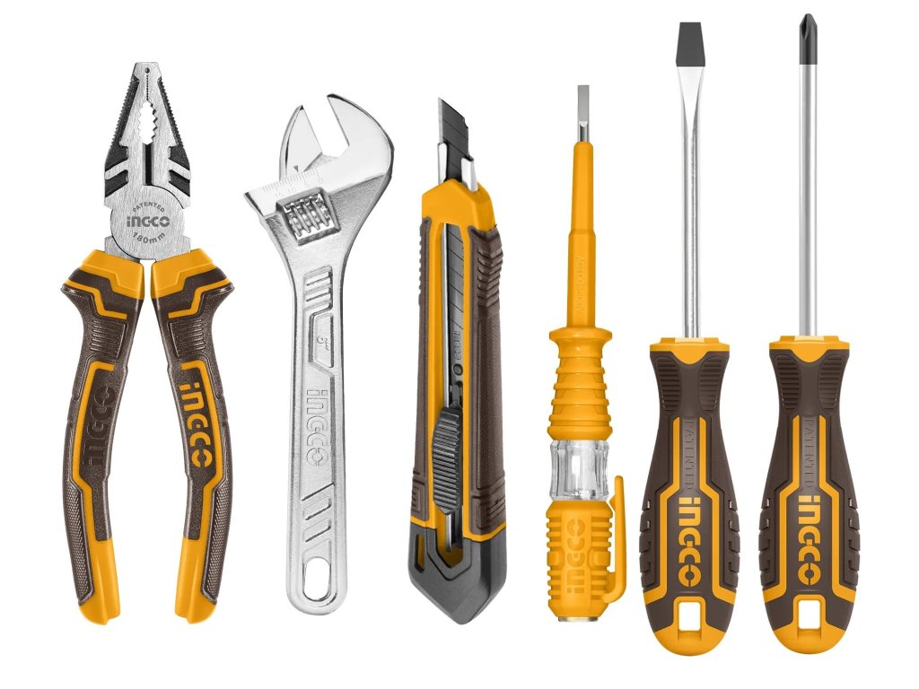 Sada ručního nářadí Ingco, Cr-V, obsahuje: 1 ks 7" 180 mm kombinované kleště, 1 ks fázový tester 00-500V AC, 1 ks 6" nastavitelný klíč, 1 ks nůž se zaklapávací čepelí 9 mm, 1 ks šroubovák SL5,5 x 100, 1 ks šroubovák PH1x100, 1 ks svinovací metr 3 m