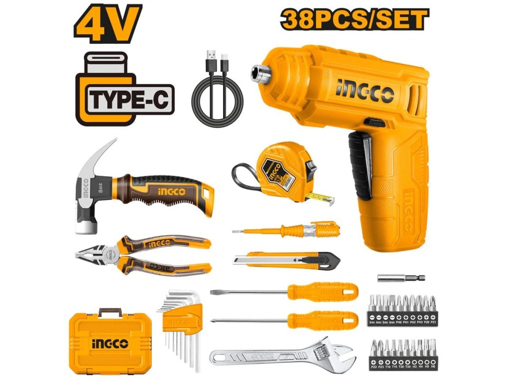 Sada 38 ks domácího nářadí obsahuje: 1 ks 4V lithium-iontový akumulátorový šroubovák (CSDLI0402) s 1 ks nabíjecím kabelem USB, šestihranná stopka: 1/4", rychlost naprázdno: 180 ot./min., maximální točivý moment: 4 Nm, 1 ks magnetický držák bitů, 1 ks šroubovák SL5.5 x 100, 1 ks šroubovák PH1 x 100, 1 ks 6" kombinované kleště, 1 ks 6" nastavitelný klíč, 1 ks mini kladivo, 1 ks testovací tužka (zkušební napětí: 100-500VAC), 1 ks 3 m svinovací metr, 1 ks 9mm odlamovací nůž, 20 ks šroubovacích bitů