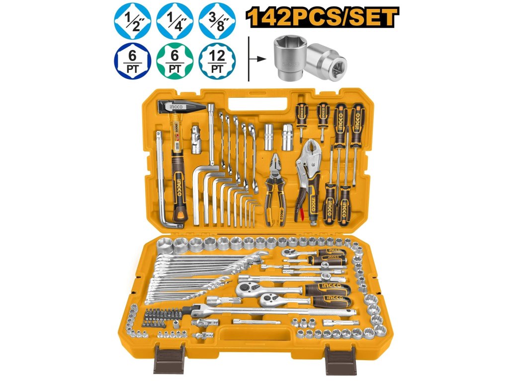 Sada nářadí v kufříku 142 ks, obsahuje: 19ks 1/2" šestihranný: 8-10-12-13-14-15-16-17-18-19-20-21-22-23-24-25-27-30-32 mm, 5 ks 1/2" hvězdicový: E10-12-14-16-20 mm, 1 ks 1/2" flex. rukojeť 375 mm, 1 ks 1/2" ráčnový klíč 45T, 2ks 1/2" prodlužovací tyč: 75 mm, 250 mm, 1 ks 1/2" univerzální kloub, 1 ks 1/2" třícestný adaptér, 2 ks 1/2" 16 a 22 mm, 1ks 1/2 " 10" rukojeť, 15 ks 3/8" 12pt. zásuvka: 6-7-8-9-10-11-12-13-14-15-17-18-19-21-22, 1ks 3/8" ráčnový klíč 45T, 2ks 3/8" prodlužovací tyč 75 mm a 150 mm, 1ks 3/8" univerzální kloub, 26 ks 1/4 " 25 mm šroubovací bity: PH0-PH1-PH1-PH2-PH2-PH3-PZ0-PZ1-PZ2-PZ3-SL4-SL5-SL6-SL7-H2-H3-H4-H5-H6-T10H-T15H-T20H-T25H-T27H-T30H-T40H, 1 ks držák, bitů 9 ks 1/4" šestihranný: 4-4,5-5-5,5-6-7-8-9-10, 5 ks 1/4" hvězdicový: E4-5-6-7-8, 1ks 1/4" ráčnový klíč 45T, 3 ks 1/4" prodlužovací tyč: 50 mm, 100 mm a 150 mm, 1ks 1/4" univerzální kloub, 1ks 3/8" (F) * 1/4" (M) třícestný, adaptér 1ks 1/4 " 150 mm otočná rukojeť, 1ks 1/4" 150 mm flexibilní prodlužovací tyč, 17 ks kombinovaný klíč: 6-7-8-9-10-11-12-13-14-15-16-17-18-19-21-22-24, 5 ks klíč na převlečné matice: 8-10-10-12-11-13-12-14-17-19, 10 ks imbusový klíč: 2,5-3-4-5-6-7-8-10-12-14 mm, 1 ks 300g kladivo, 1 ks 7" kombinované kleště, 1ks 10" zakřivený klíč, zámek čelistí, 2ks S2 plochý šroubovák: SL6,5 x 100 SL6,5 x 150, 2ks S2 křížový šroubovák: PH2 x 100 PH2 x 150, 2 ks stubby šroubovák: PH2 x 38 SL6,5 x 38