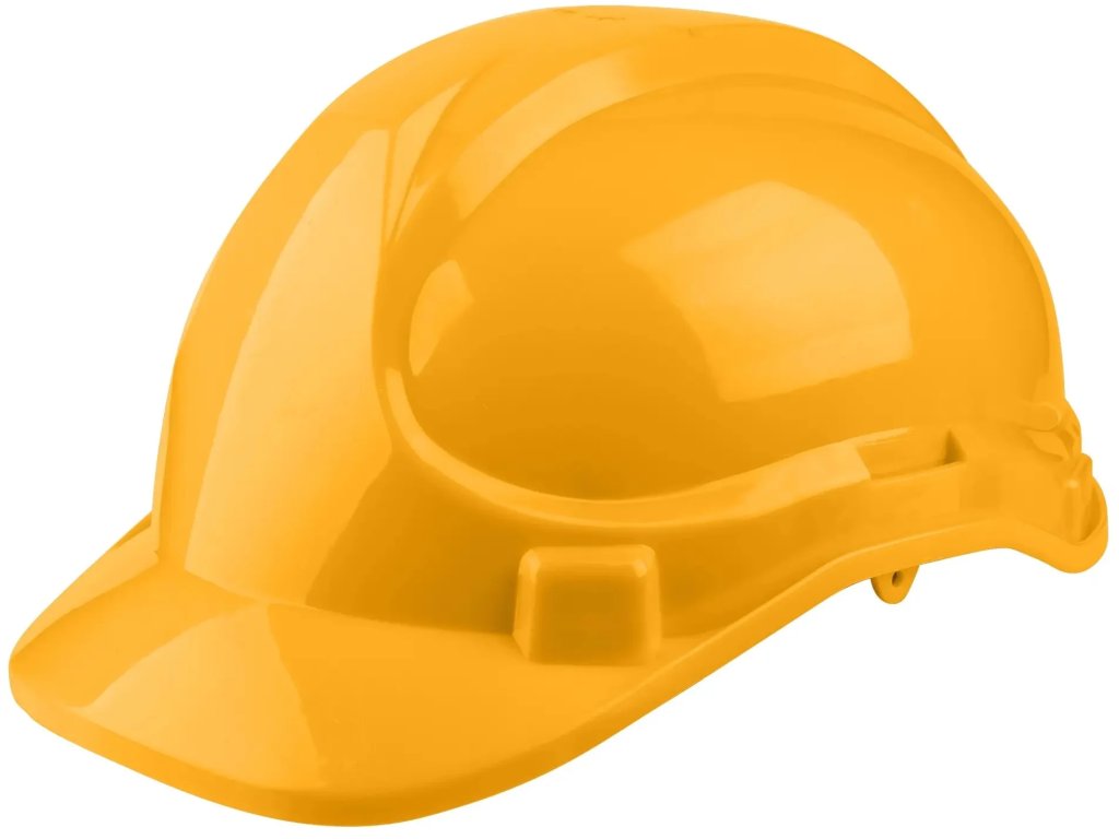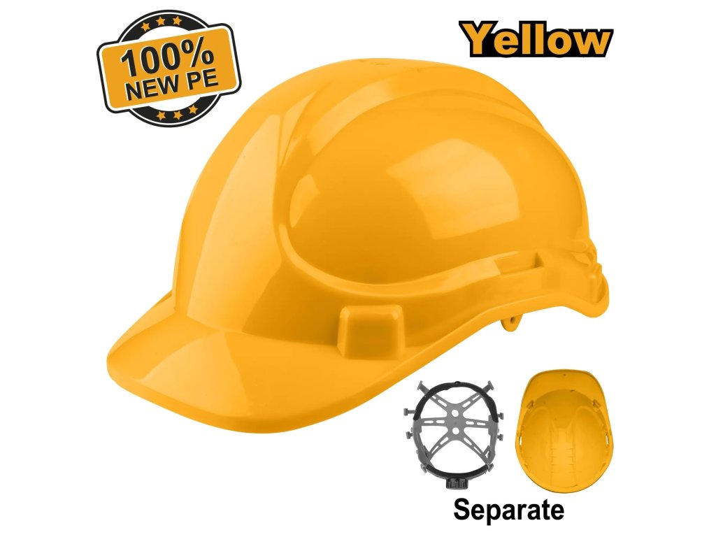 Přilba ochranná žlutá, plast, PE skořepina s větracími otvory, řemínek pod bradou, 8 bodové zavěšení, lze upravit velikost pomocí přezky, hmotnost 330g