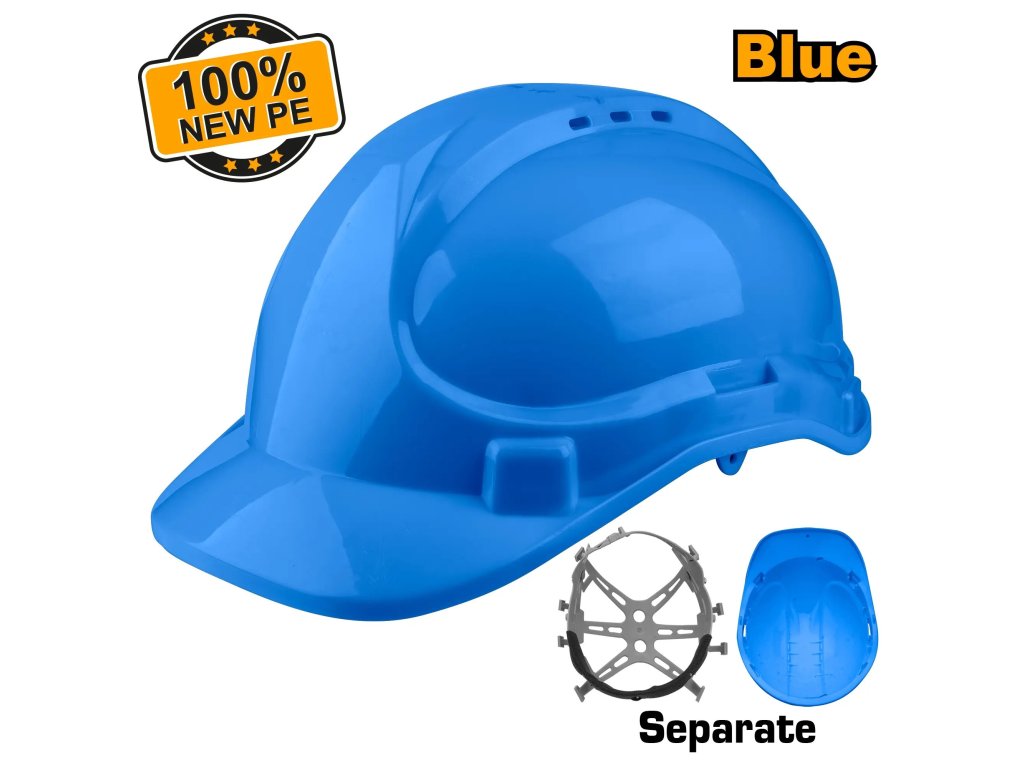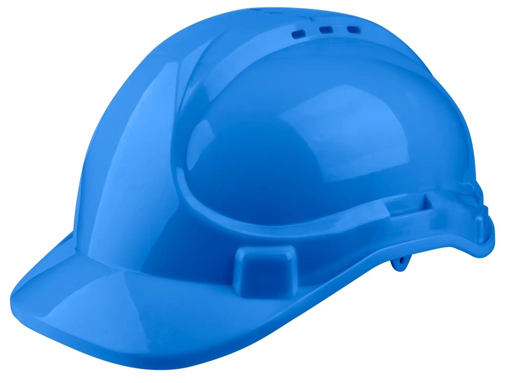 Přilba ochranná modrá, plast, PE skořepina s větracími otvory, řemínek pod bradou, 8 bodové zavěšení, lze upravit velikost pomocí přezky, hmotnost 330g