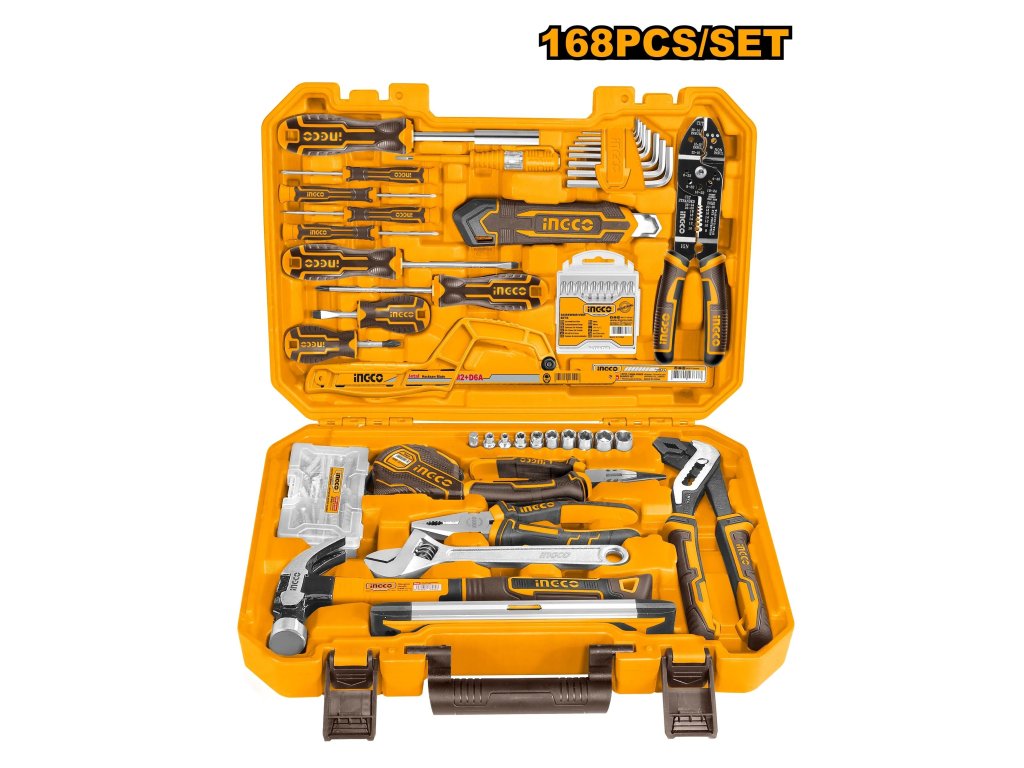 Tato komplexní sada ručního nářadí obsahuje 168 kusů, které pokrývají širokou škálu úkolů pro domácí i profesionální použití. Sada zahrnuje nástroje, jako jsou kladivo, různé typy kleští, šroubováky, imbus klíče, zkoušečka napětí, nastavitelný klíč, svinovací metr a mnoho dalších užitečných nástrojů. Součástí jsou také 40 ks bitů, 9 ks nástrčných hlavic, adaptér pro hlavice a náhradní čepelí. Vše je přehledně a bezpečně uloženo v přenosném kufříku, což umožňuje snadnou organizaci a přenos.