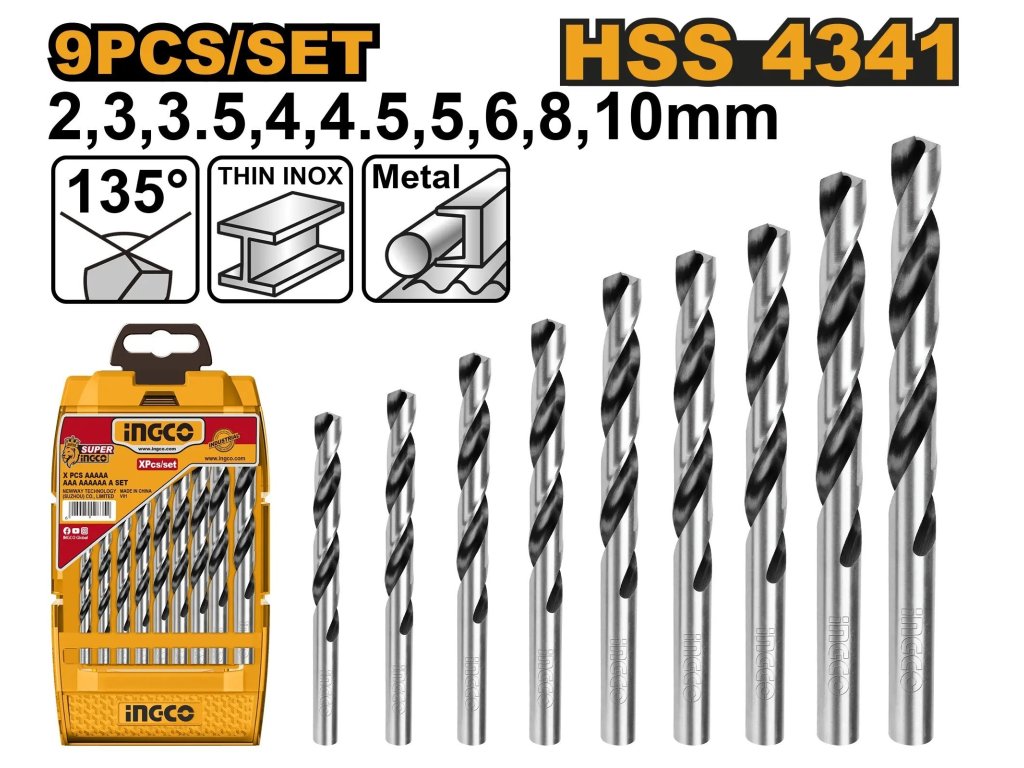 • Sada obsahuje: 9 ks HSS 4341 spirálových vrtáků v následujících velikostech: 2 mm, 3 mm, 3,5 mm, 4 mm, 4,5 mm, 5 mm, 6 mm, 8 mm, 10 mm