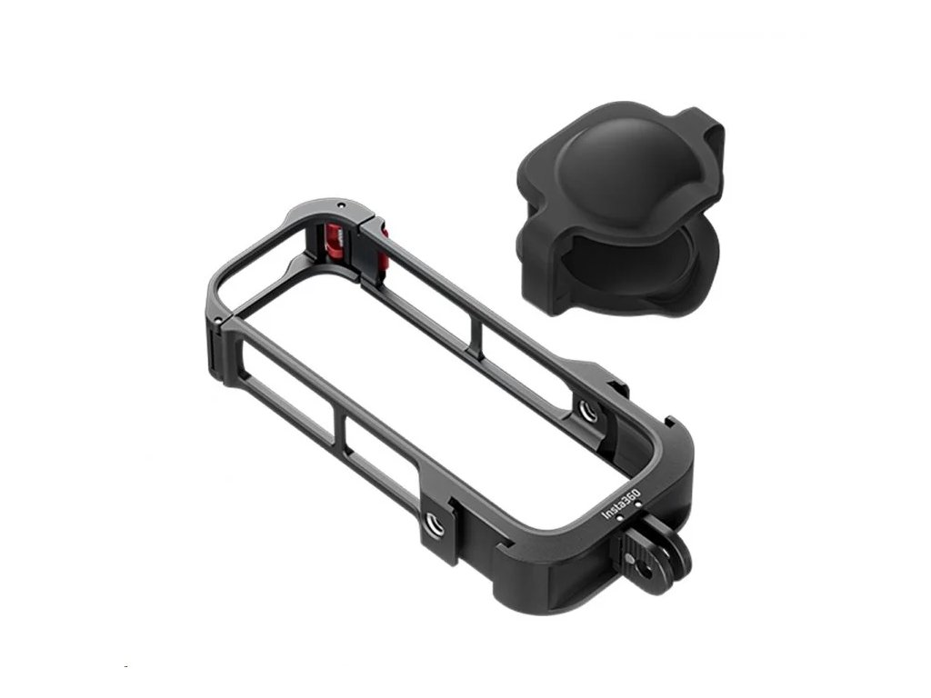 Rámeček pro uchycení příslušenství ke kameře Insta360 X4. Rám chrání tělo a objektivy kamery. Na obou stranách je drážka pro sáňky (Cold shoe) a na spodní straně je multifunkční adaptér - 1/4 palcový závit nebo vidlice.