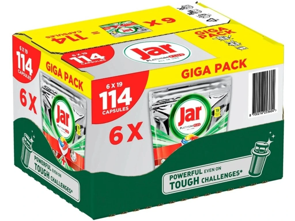 Kapsle Jar Platinum Plus All In One do automatické myčky nádobí zanechávají nádobí čisté jako nové a mají nejlepší čisticí účinky Jaru na odolné zbytky jídla. Pomáhají dokonce odstraňovat zašedlost vznikající časem a obnovují původní lesk nádobí. Jar Platinum Plus poskytuje vynikající čistotu a odstraňuje odolné skvrny od jídla i v podmínkách krátkého cyklu. Pokud tedy máte málo času, nic se neděje. Přepněte na krátký režim. Jar v sobě slučuje tekutý i práškový čisticí prostředek v jedné účinné kapsli. Vysoce rozpustný obal se rychle rozpouští a funguje dobře i při krátkých cyklech, protože nádobí se začíná ihned umývat. A navíc se kapsle tak snadno používají! Kapsli není třeba rozbalovat a stačí ji jen vložit do přihrádky myčky na mycí prostředek. Přepněte na krátký cyklus a ušetřete oproti běžnému standardnímu cyklu čas, energii a vodu!