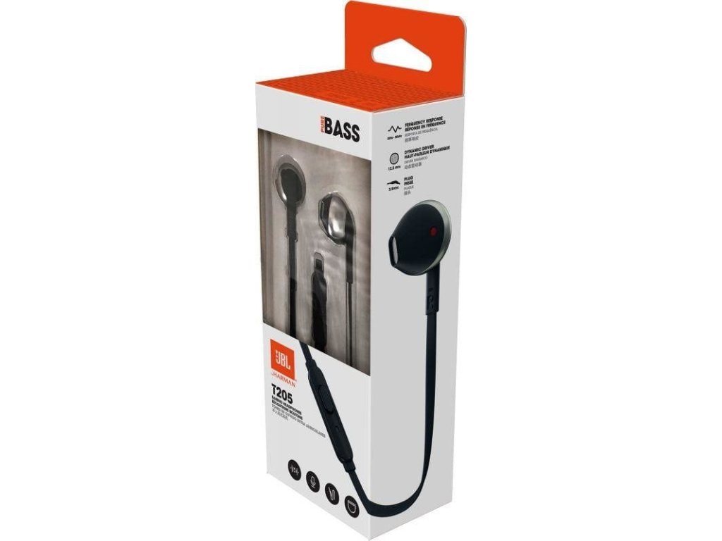 Sluchátka do uší JBL T205, měnič 12,5mm, 20Hz-20kHz, zvuk JBL Pure Bass, kabel odolný proti zamotání, barva černá.