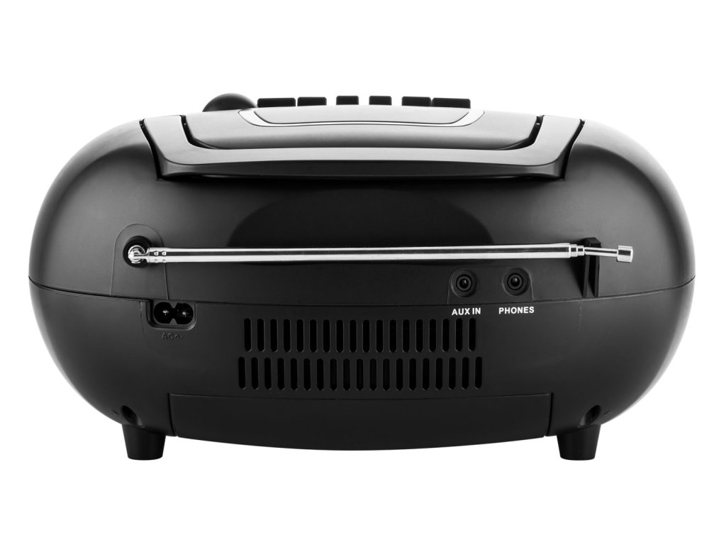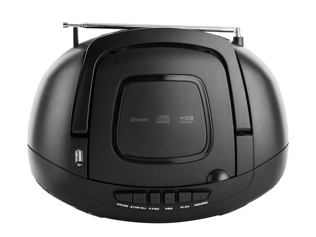Přehrávač s CD, FM tunerem, Bluetooth, USB vstupem, podpora MP3, kazetová mechanika, AUX vstup, sluchátkový výstup, černý