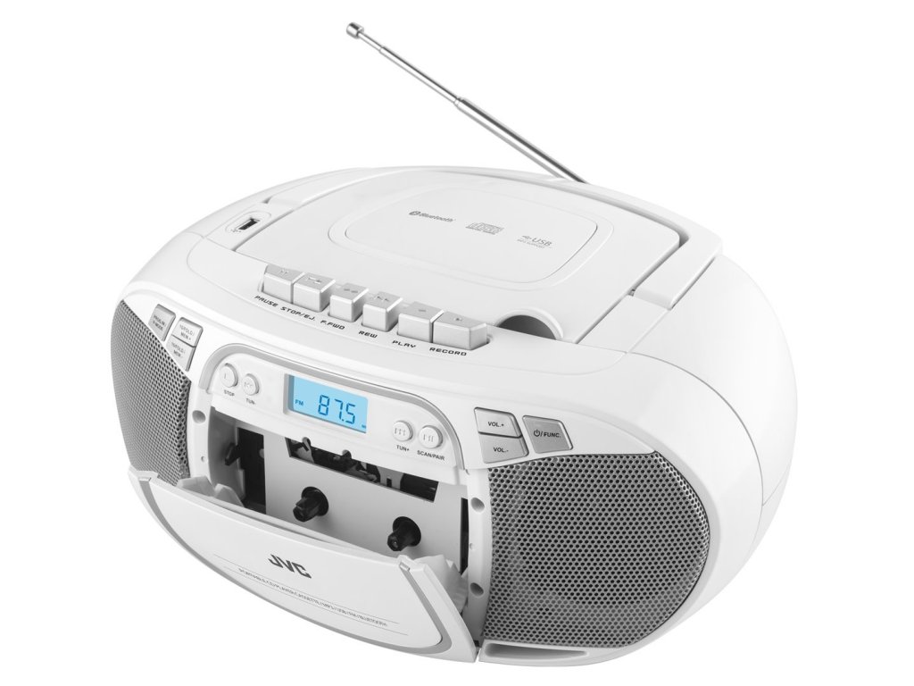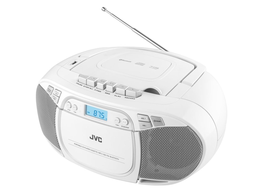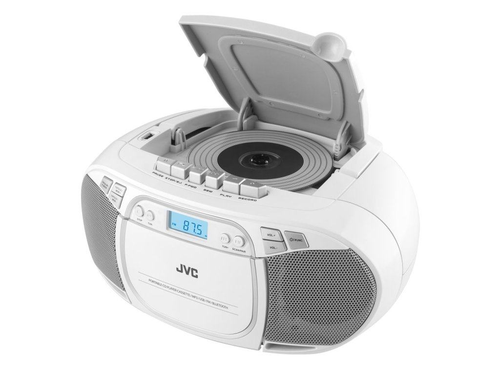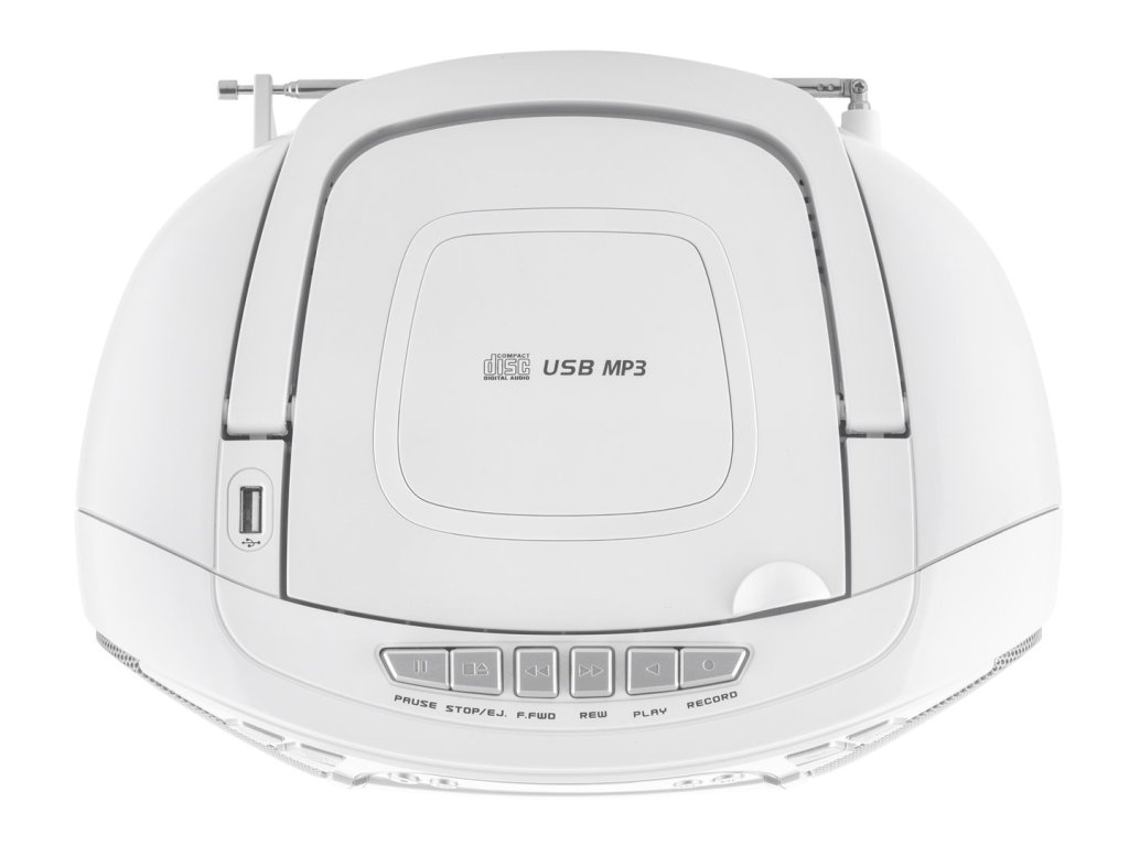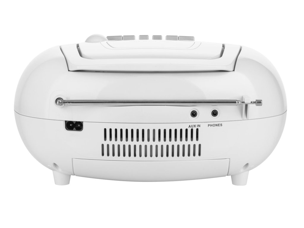 Přehrávač s CD, FM tunerem, Bluetooth, USB vstupem, podpora MP3, kazetová mechanika, AUX vstup, sluchátkový výstup, bílý