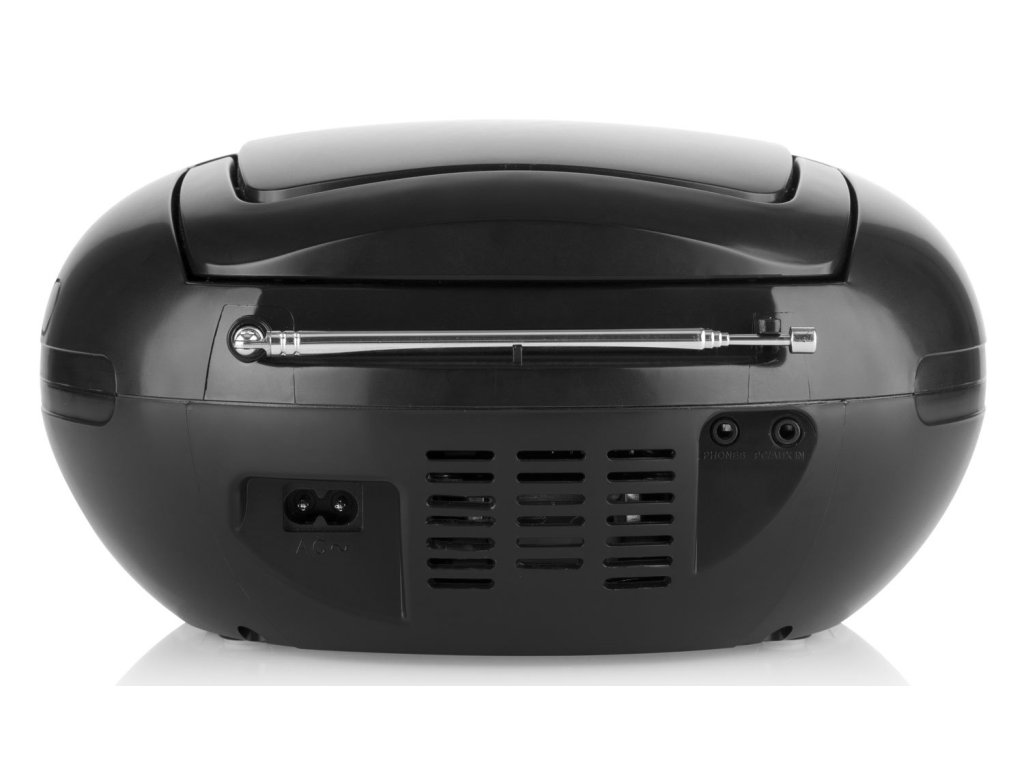 Přehrávač s CD, FM tunerem, USB vstupem, podpora MP3, AUX vstup, sluchátkový výstup, černý