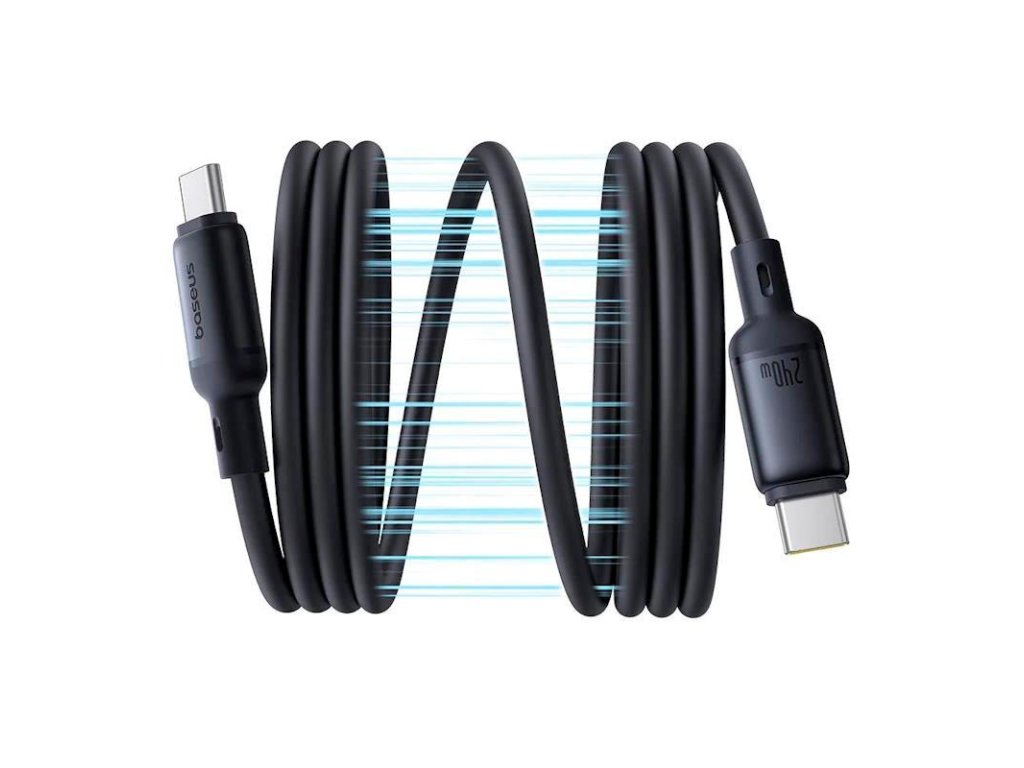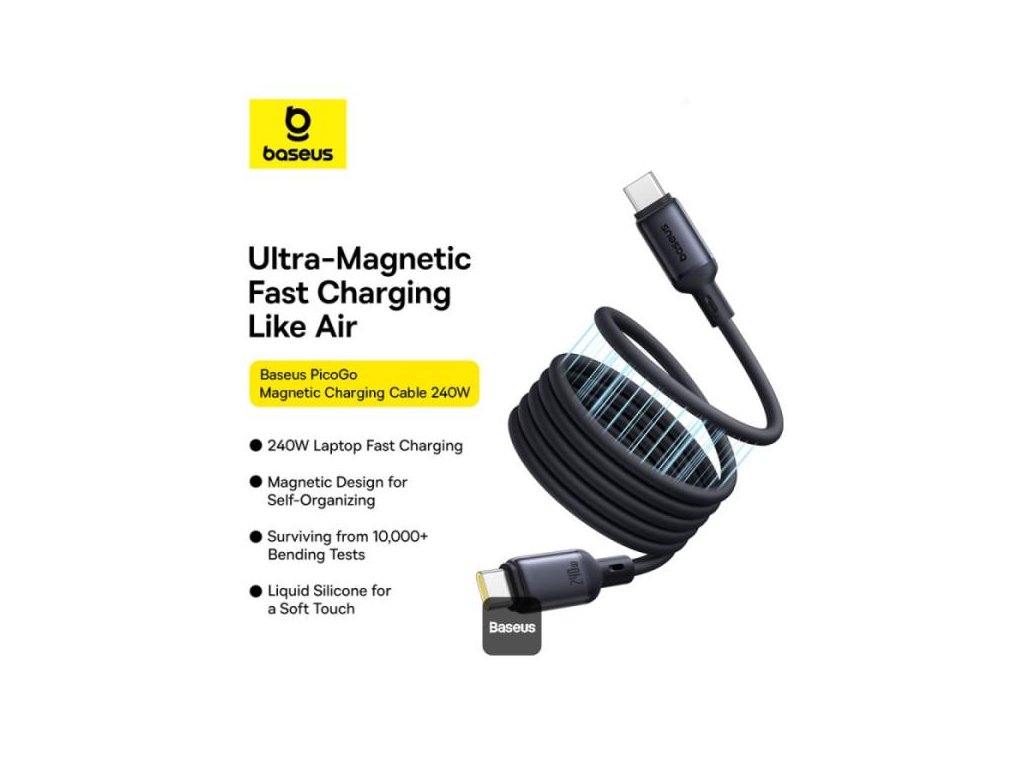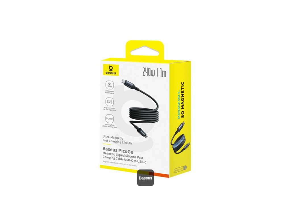 Kabel Baseus PicoGo, USB-C/USB-C, délka 1m,magnetický samonavíjecí kabel, vysokorychlostní nabíjecí kabel, výkon 240W,přenos dat 480 Mb/s,měkký materiál z tekutého silikonu - odolný, pružný a měkký, barva černá
