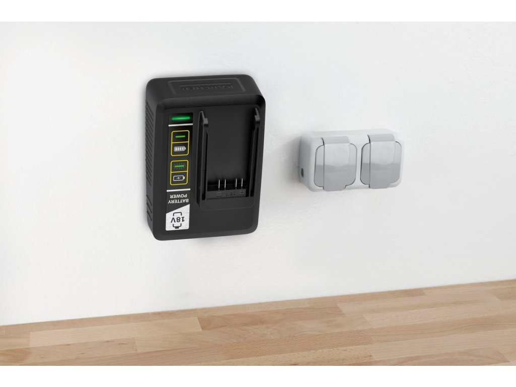 Díky integrovanému držáku na zeď lze rychlonabíječku snadno připevnit ke zdi. Rychlonabíječka nabíjí vyměnitelnou baterii 18 / V 2,5 Ah Kärcher na 80% za pouhých 44 minut.