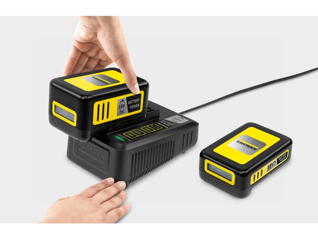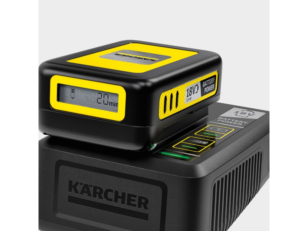 Nabije vyměnitelnou baterii 18 V / 2,5 Ah Kärcher Battery Power za 44 minut na 80 %. Nabije vyměnitelnou baterii 18 V / 5,0 Ah Kärcher Battery Power za 94 minut na 80 %.