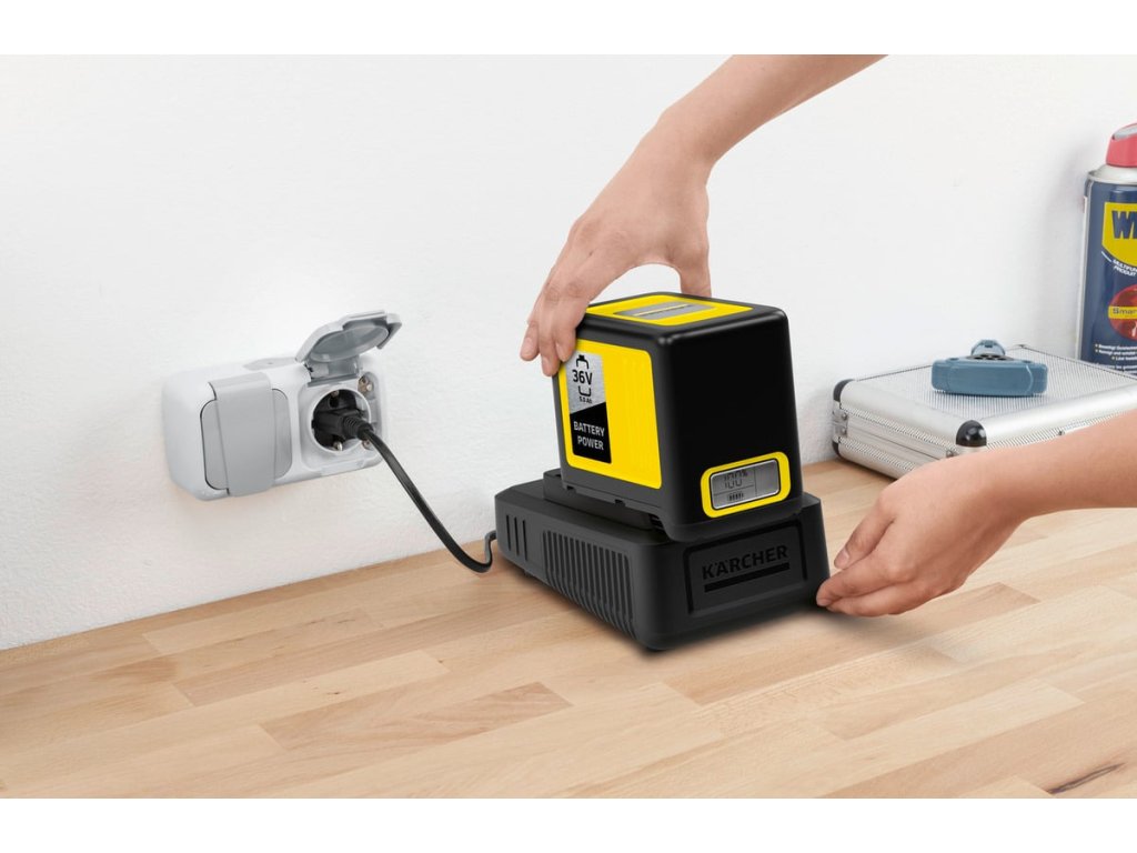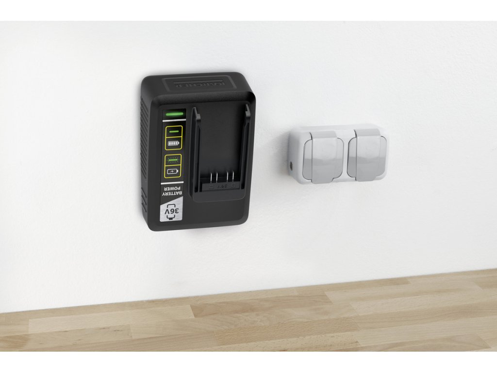 Rychlonabíječka ze Starter Kit Kärcher Battery Power 36/50 zajistí za pouze 1,5 hodiny nabití vyměnitelné baterie 36 V / 5,0 Ah Kärcher Battery Power na 80 procent. Sada se hodí pro použití ve všech zařízení bateriové platformy Kärcher 36 V.