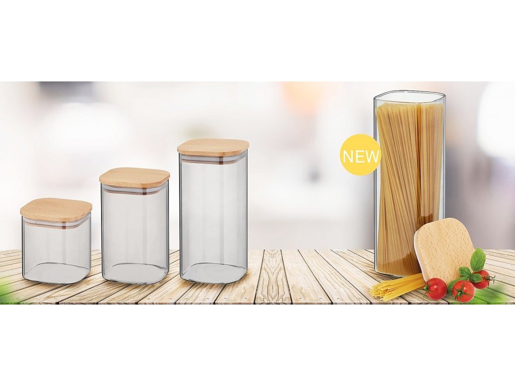 Je vyrobena z borosilikátového čirého skla pro snadný a rychlý přehled obsahu. Sklo je lehce tónované, což zajišťuje lepší ochranu před slunečním zářením. Víčko z bukového dřeva se silikonovým těsněním zajistí perfektní těsnost. Skladované potraviny zůstanou díky tomu déle čerstvé.