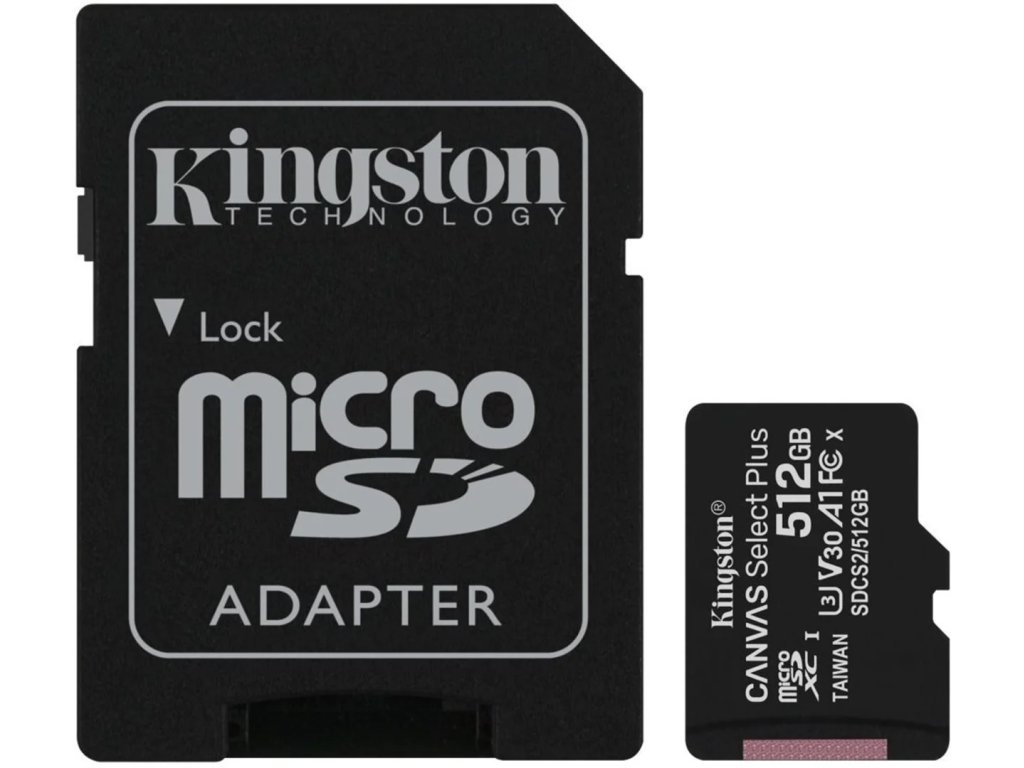 Kingston microSDXC 512GB Canvas Select Plus, UHS-I, U3, V30, čtení 100 MB/s, zápis 85MB/s) + SD adaptér