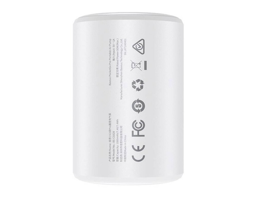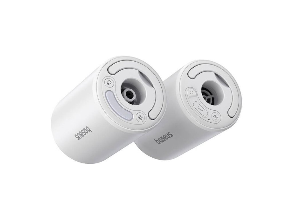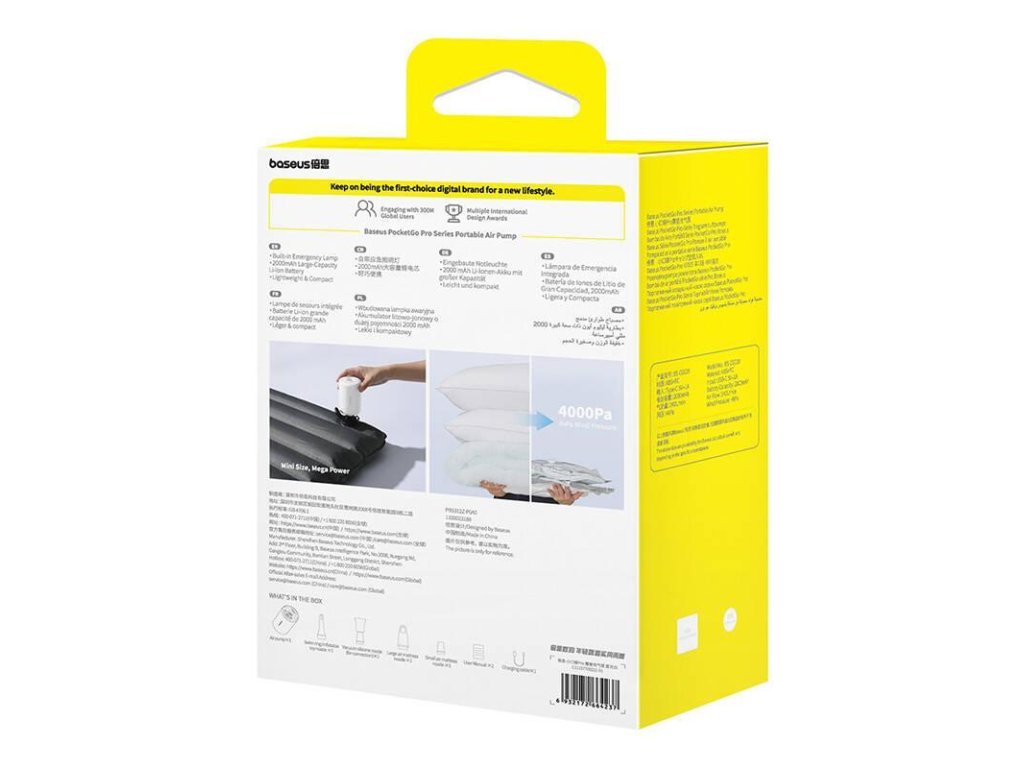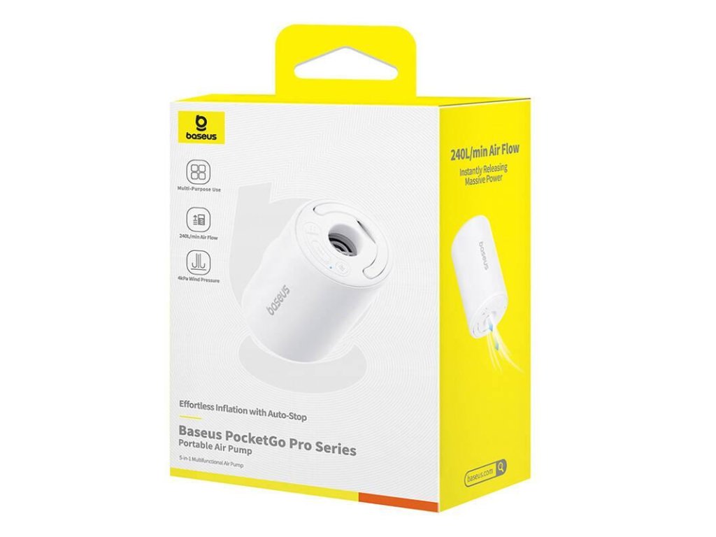 Kompresor Baseus PocketGo Pro,baterie o kapacitě 2000 mAh (nafoukne až 12 samostatných matrací),vestavěné LED světlo, závěsné madlo,motor s rychlostí 48000 ot./min,průtok vzduchu 240 l/min, barva bílá