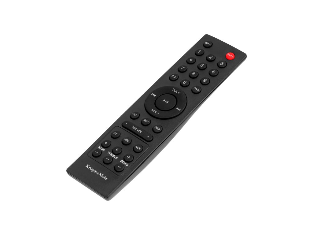 Mnohem širší možnosti ovládání Bluetooth reproduktoru Kruger&Matz Spiral zaručuje dálkový ovladač, který je součástí sady. Díky němu můžete libovolně upravovat zvuk, nahrávat a přehrávat zvuky a vybírat zdroje zvuku.