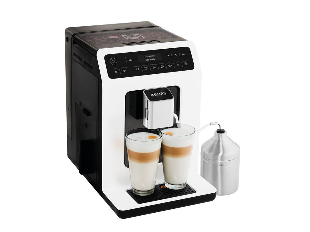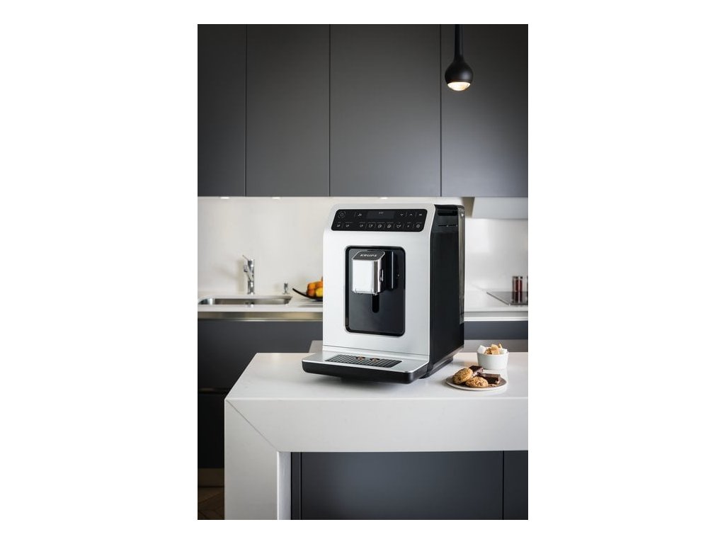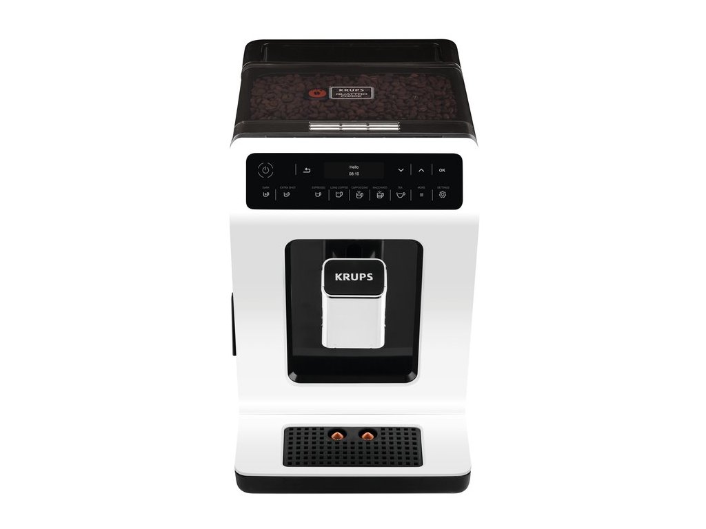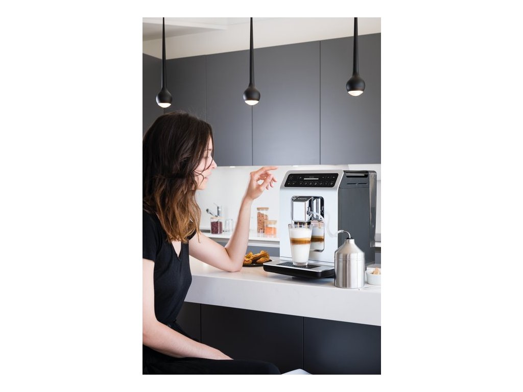 automatický kávovar • snadné čištění • hustá mléčná pěna stiskem jednoho tlačítka • kovový kónický mlýnek • příprava dvou šálků najednou • funkce horké vody • cappuccino a latte • 3 nastavení teploty kávy • displej • automatické vypnutí