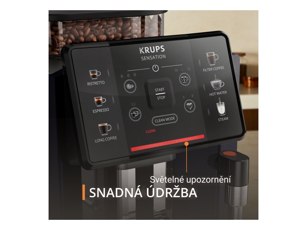 Kávovar KRUPS Sensation vám splní každé přání, od dokonalého ristretta po horký šálek ranní filtrované kávy. Vhodný pro každou velikost nápoje, takže máte vskutku nekonečné možnosti výběru pro váš dokonalý šálek. Integrovaná technologie Barista Inside navíc zaručuje dokonalou kvalitu při každém použití. Díky praktickým funkcím jako je přehledný dotykový panel, přizpůsobitelné recepty a světelné upozornění ještě nikdy nebylo tak snadné si vychutnat šálek své oblíbené kávy.