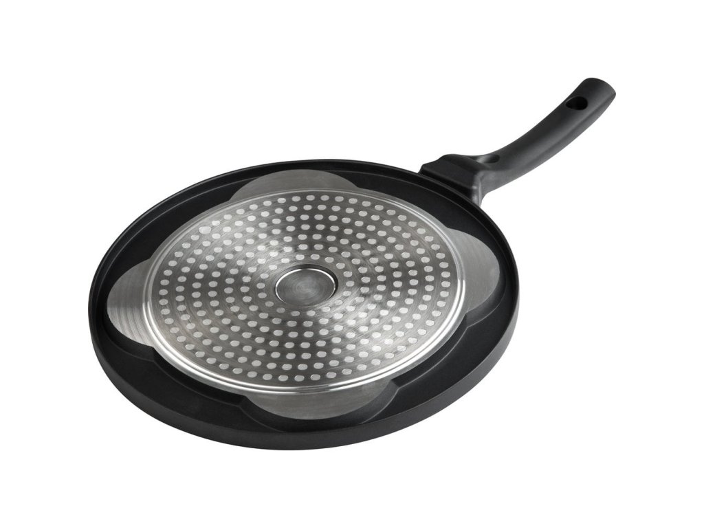 pánev na lívance • hliníkové nádobí • pro všechny typy sporáků • adhezivní povrch • ergonomická měkčená rukojeť • nepřilnavý materiál bez PFOA • rychlé přenášení tepla • indukční dno • průměr 26 cm • výška 3 cm • hmotnost 1,04 kg