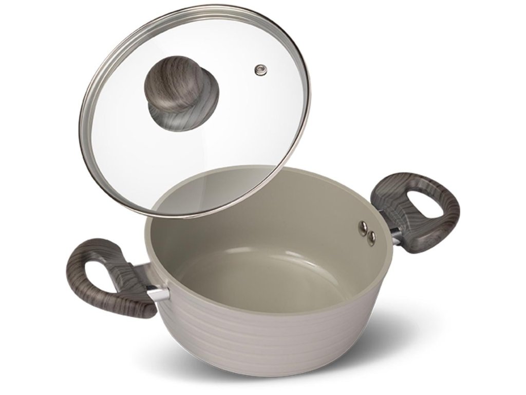 Nádobí opatřeno vnitřním keramickým povrchem odolným proti oděru a připalování, silným dnem a velmi elegantními úchyty pro větší bezpečnost, funkčnost a pohodlí