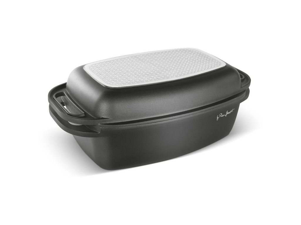 pekáč s víkem • objem 5,5 l • nepřilnavý keramický povrch • silné dno • snadná údržba • vhodný pro plynové, elektrické, sklokeramické sporáky • materiál: hliník • rozměry: 40 × 22,5 × 17 cm
