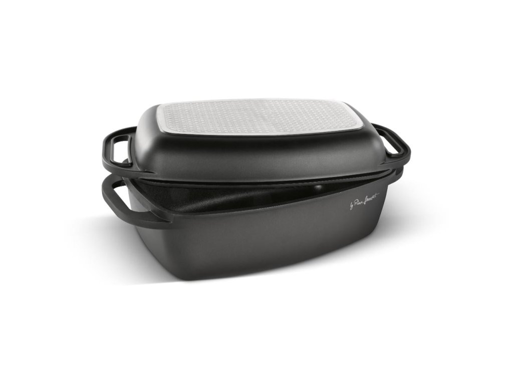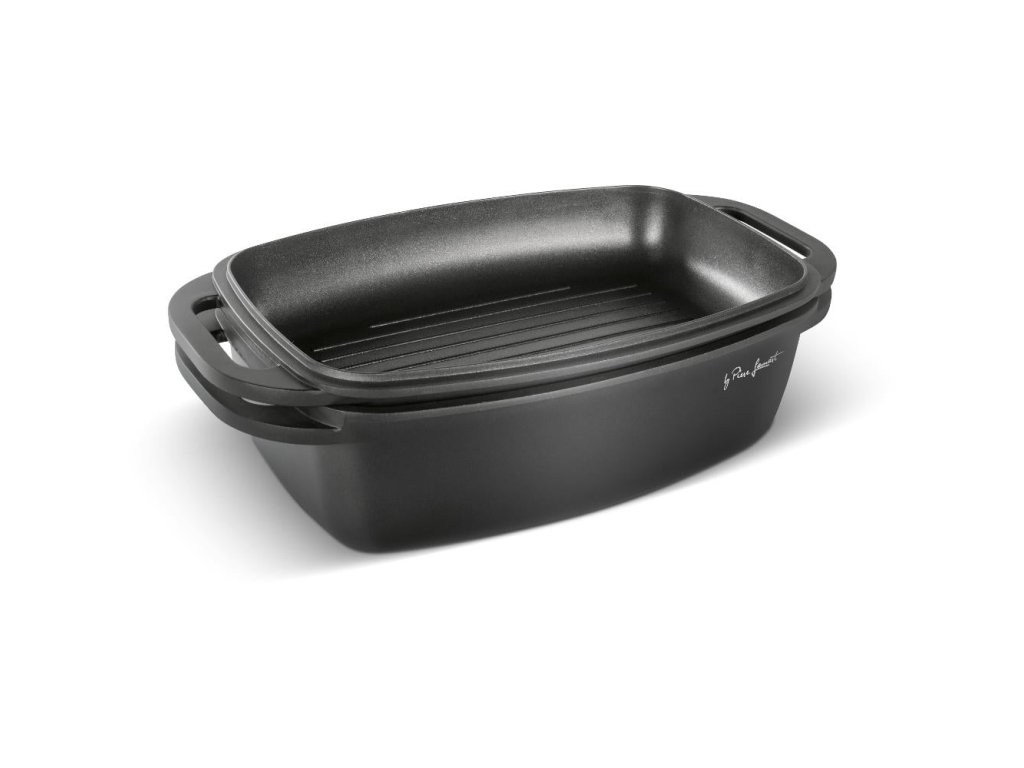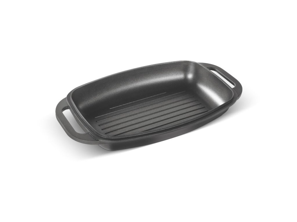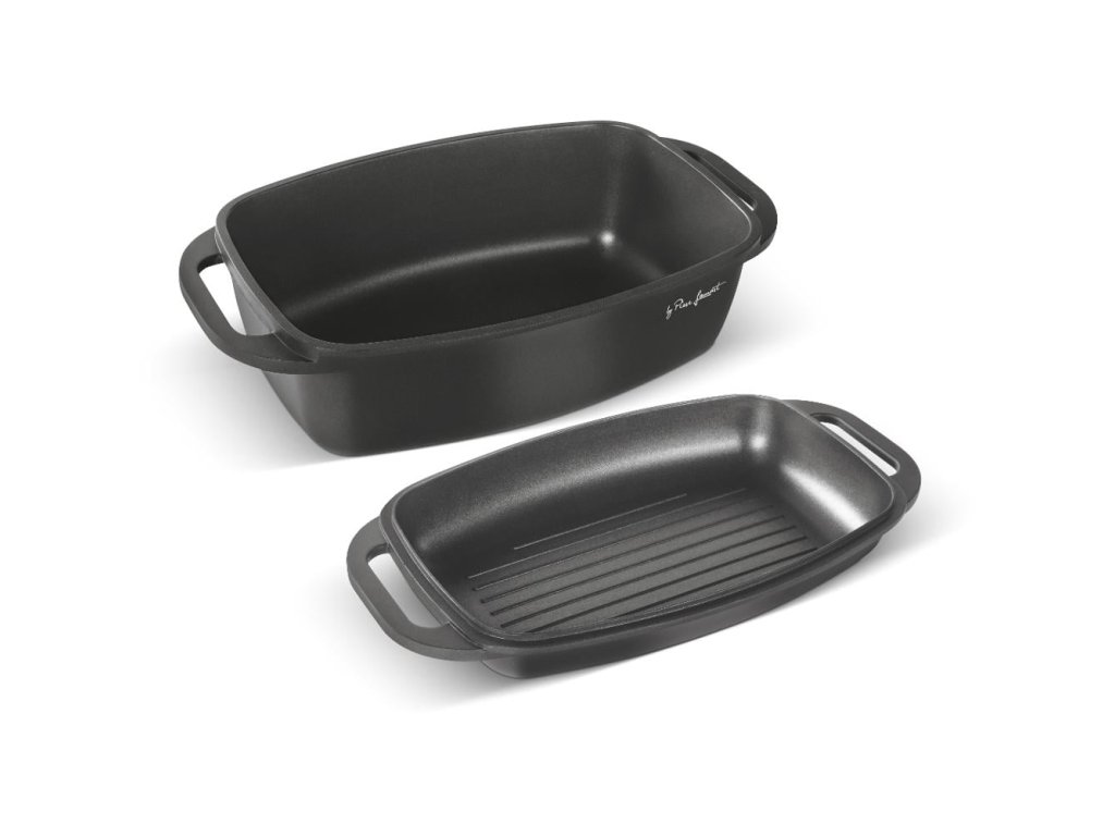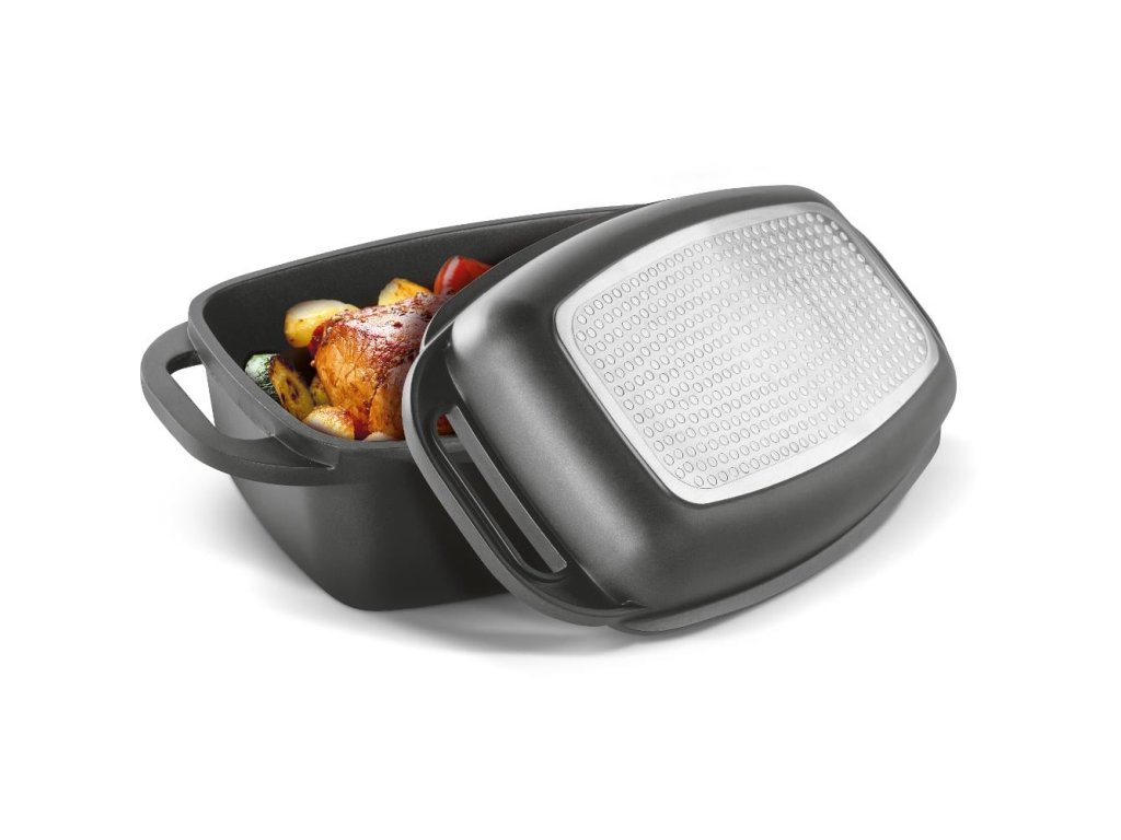 Kvalitní hliníkový litý pekáč a grilovací víko s vnitřním nepřilnavým povrchem odolným proti připalování, opatřen silným dnem u obou nádob.