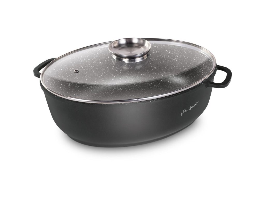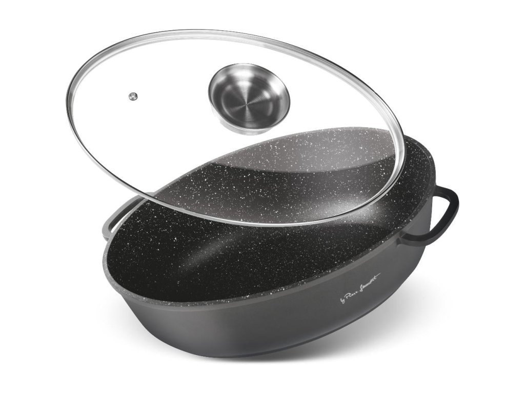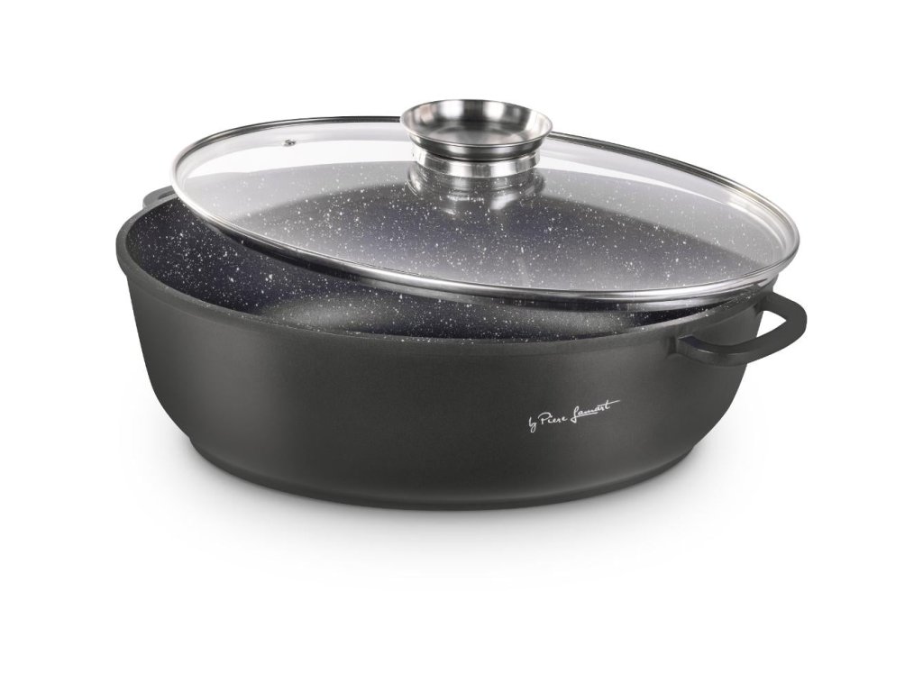 Kvalitní hliníkový litý pekáč se skleněným víkem s vnitřním povrchem odolným proti připalování, opatřen silným dnem. Poklice z odolného varného skla s aroma otvorem páry pro dokonalou kontrolu vaření.