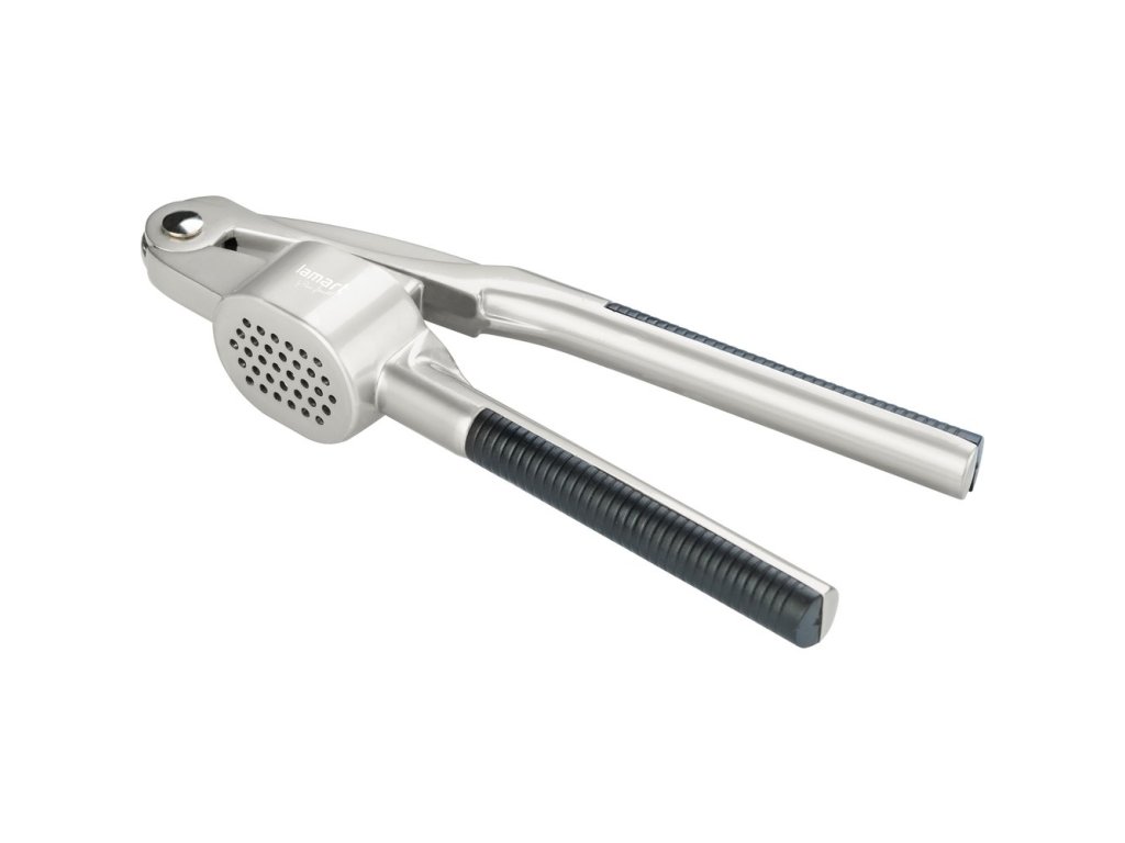 Kovový lis na česnek nahradí pracné tření česneku nožem. Stačí vložit oloupaný stroužek česneku a tlakem, stiskem rukojetí, dojde k prolisování stroužku skrz otvory. Do polévky, pomazánky i bramboráků.