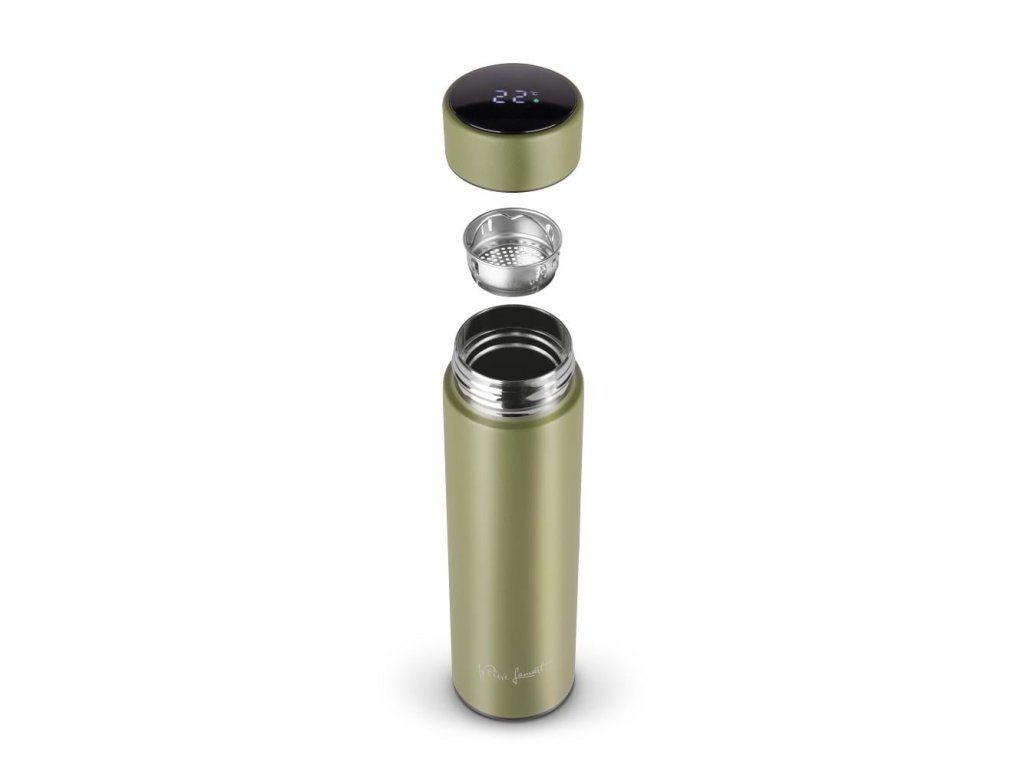 Termoska z vysoce kvalitní nerezavějící oceli a s integrovaným digitálním teploměrem ve víčku.