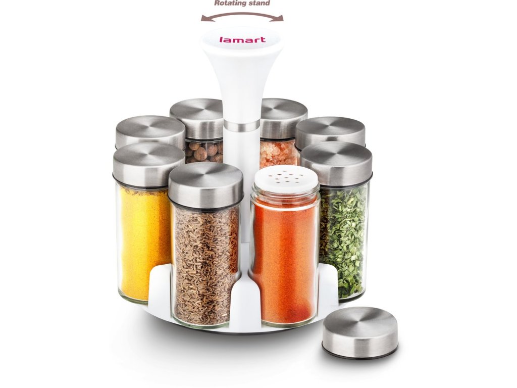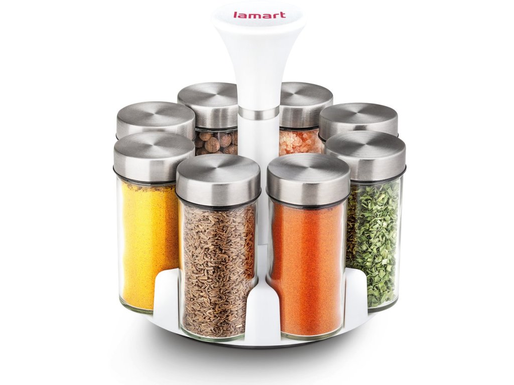 Absolutní nutností při vaření a pečení je perfektní dochucení. Designovým a zároveň praktickým pomocníkem je otočný plastový stojan s rukojetí s 8 kořenkami objemu 85 ml. Usnadní vám hledání koření a urychlí tak přípravu pokrmů.