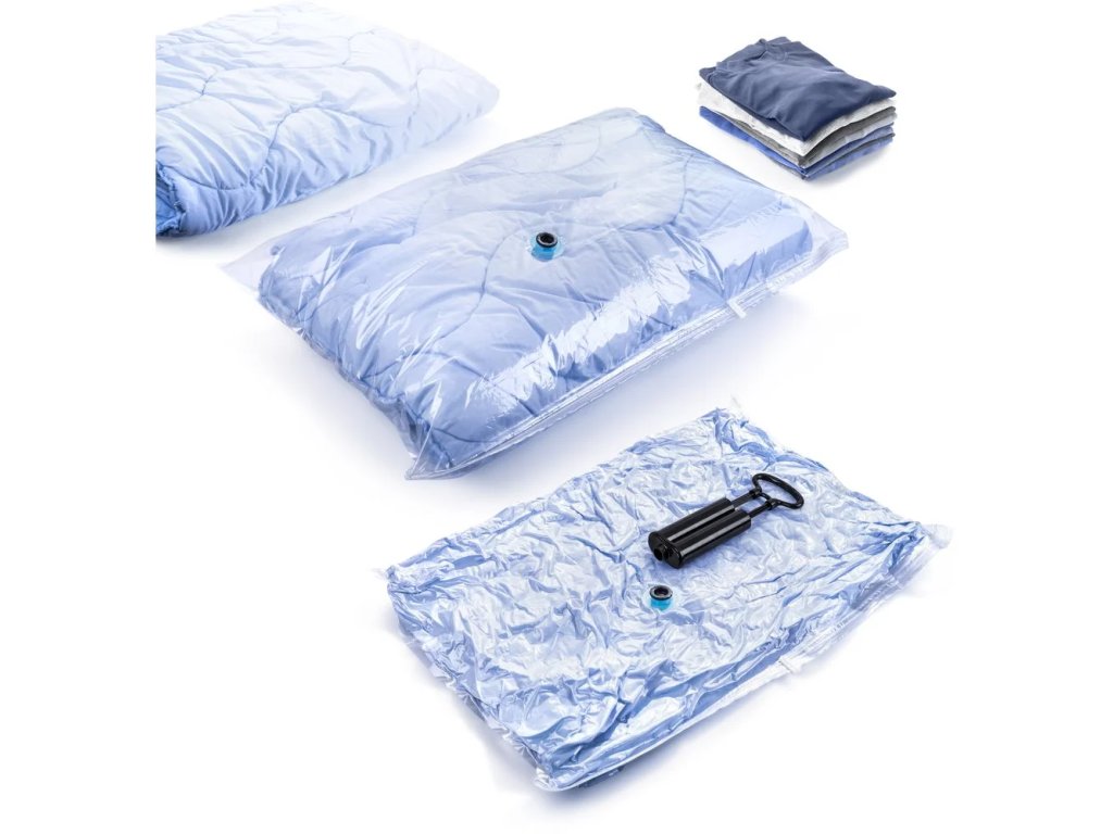 Při skladování ušetříte až 80% místa. Zpětný ventil znemožňuje úniku vzduchu směrem ven. Odsávací pumpa vyrobena z plastu.