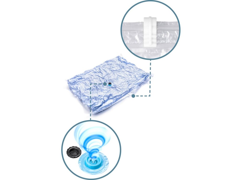 Úložný vak slouží jako ideální ochrana oděvů nebo textílie proti prachu, molům, vlhkosti nebo zápachu. Vak je antibakteriální a obsahuje vzduchotěsné zavírání a odsávací ventil pro všechny typy běžných vysavačů.