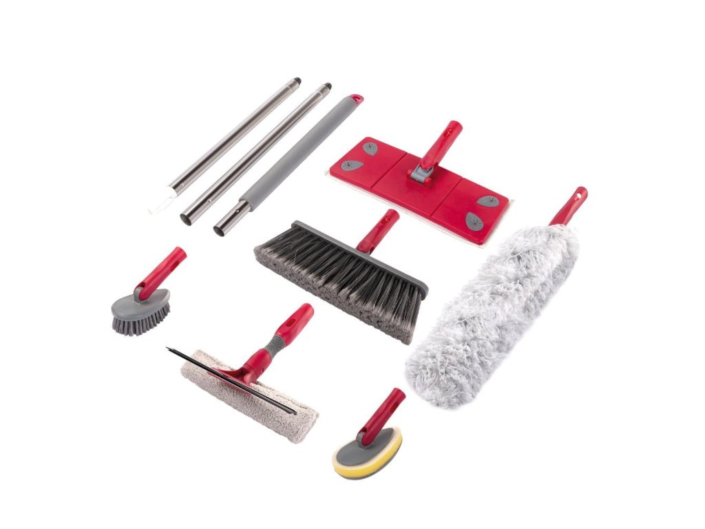 ÚKLIDOVÝ SET 7 KS CLEAN Praktická multifunkční sada na úklid, která usnadní práci v domácnosti a ušetří spoustu prostoru. Součástí sady jsou smeták 26,2x4cm x délka štětin 8 cm; mop 27x10,5cm; stěrka na okna oboustranná - 25,5 cm; drhnoucí houba 11,6x6,8cm; kartáč 11,6x6,8cm x délka štětin 3 cm; prachovka z mikrovlákna 56cm; rozkládací 3dílná tyč z nerezové oceli s měkčenou rukojetí 110 cm. Na mop je možné kromě návleku z mikrovlákna použít i netkané textilie určené k jednorázovému použití.