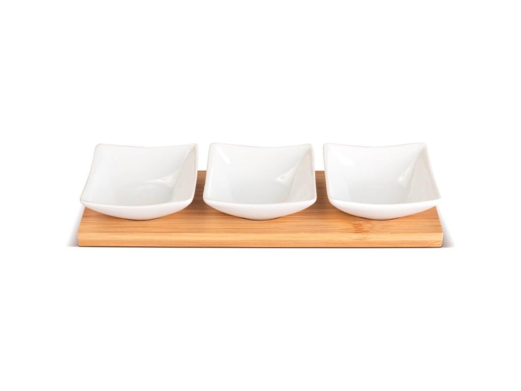 Servírovacích sada misek Bamboo na podnosu padne do oka každému milovníkovi jednoduchého a minimalistického designu. Tato sada obsahuje tři misky a jeden bambusový podnos.