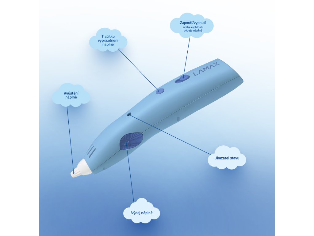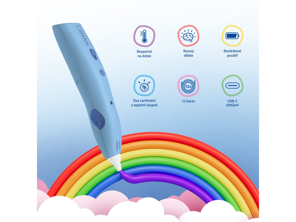 3D pero, bezdrátové, ergonomické, bezpečná LAMAX TouchSafe Technology, netoxické hypoalergenní náplně, 2 rychlosti, 2 teplotní stupně, 12 barev náplní, USB-C, průměr filamentu (náplně) 1,75 mm, modré