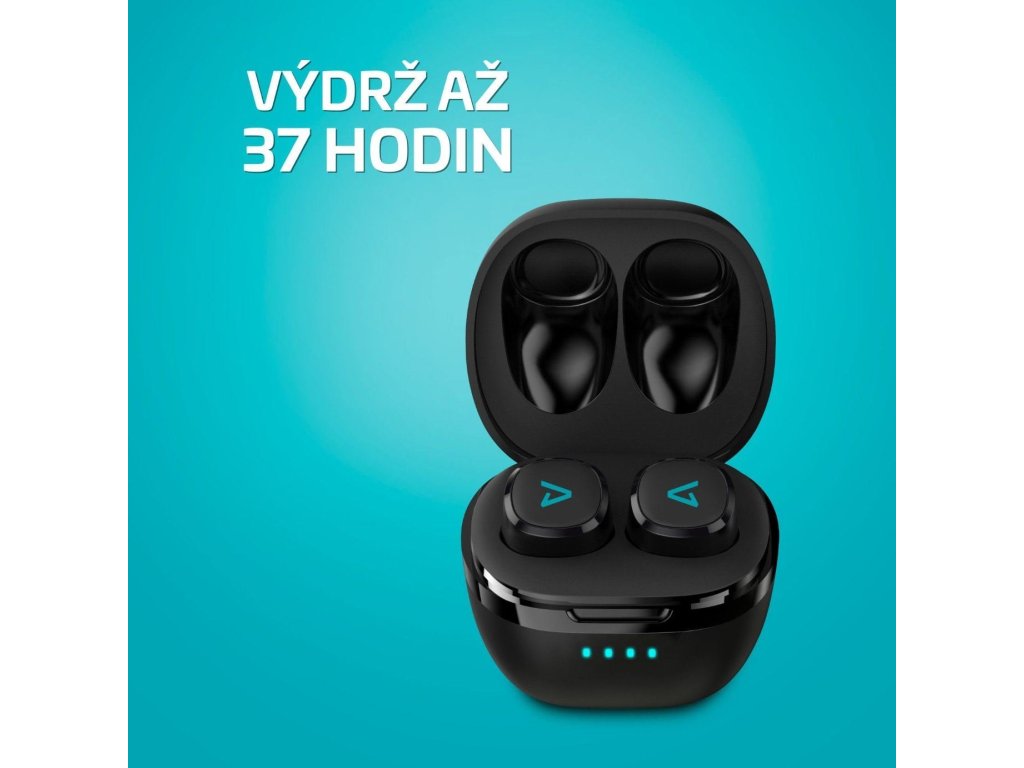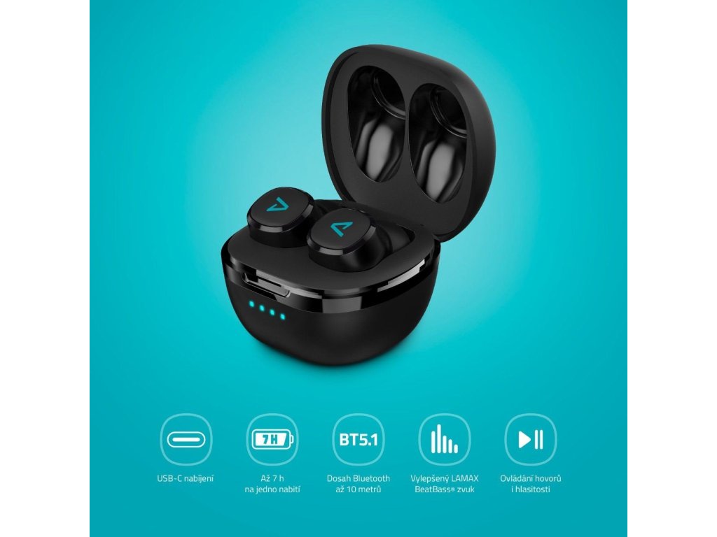 Bezdrátová True Wireless sluchátka do uší, Bluetooth 5.1, 7 hodin na jedno nabití, 37 h celkem s nabíjecím pouzdrem, USB-C nabíjení, podpora kodeků AAC a SBC, LAMAX BeatBass® technologie, podpora hlasových asistentů, automatické párování