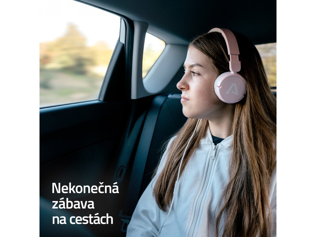 Náhlavní sluchátka s integrovaným mikrofonem, připojení přes 3,5mm jack, hlasitost omezena na 85/94 dB pro bezpečný poslech, měkké hypoalergenní náušníky, součástí balení 4 sady samolepek, růžová