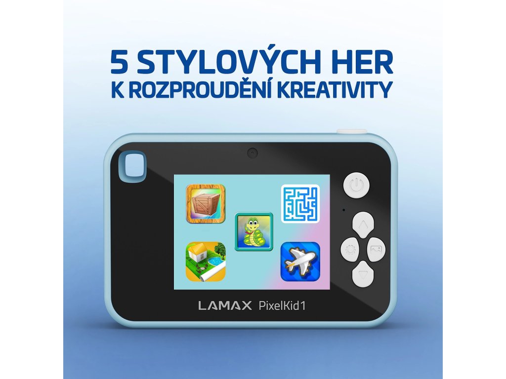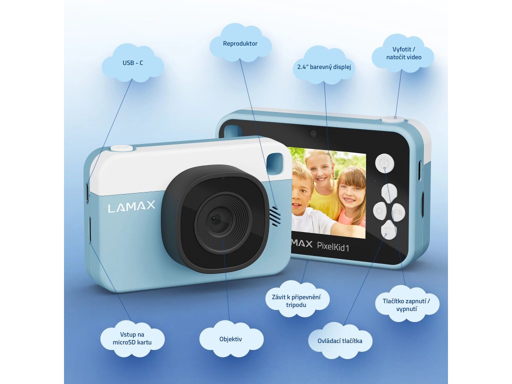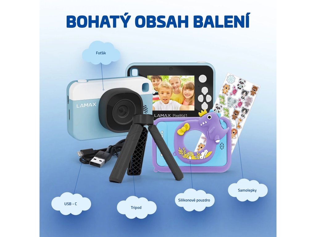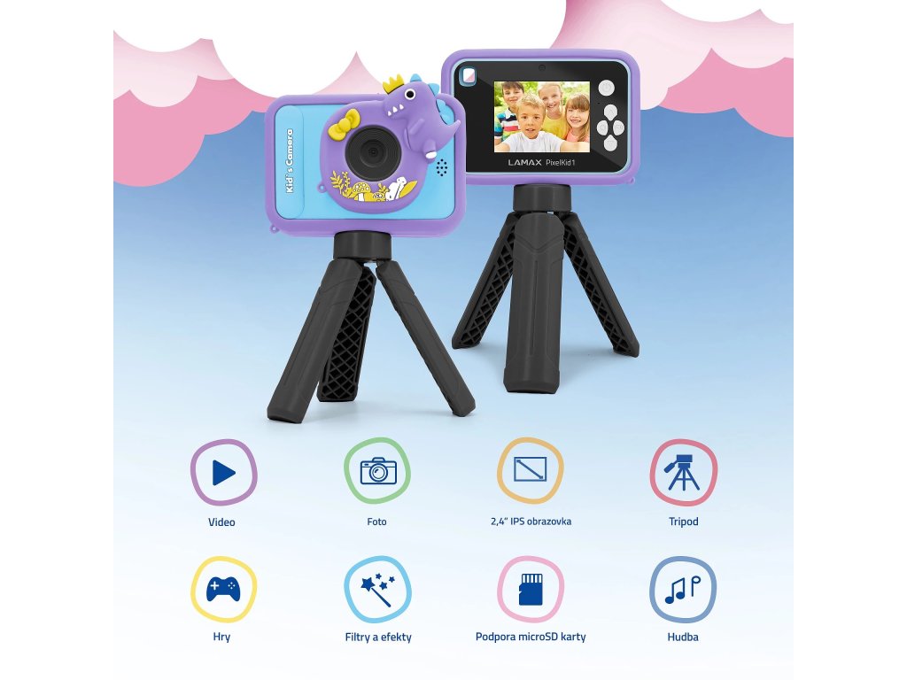 LAMAX PixelKid 1 není žádný nudný patron, ale fakt cool parťák, co má styl. Už jeho růžové a modré provedení rozhodně zaujme, a když mu dítě oblékne ještě slušivý kabátek v podobě silikonového pouzdra s dinosaurem, nikdo mu neodolá. Pokud si chce dítě pohrát a být originální, může si foťák dozdobit přiloženými samolepkami. Doladit k obrazu svému má možnost i fotky pomocí zabudovaných 28 foto rámečků, 10 efektů a 6 barevných filtrů.