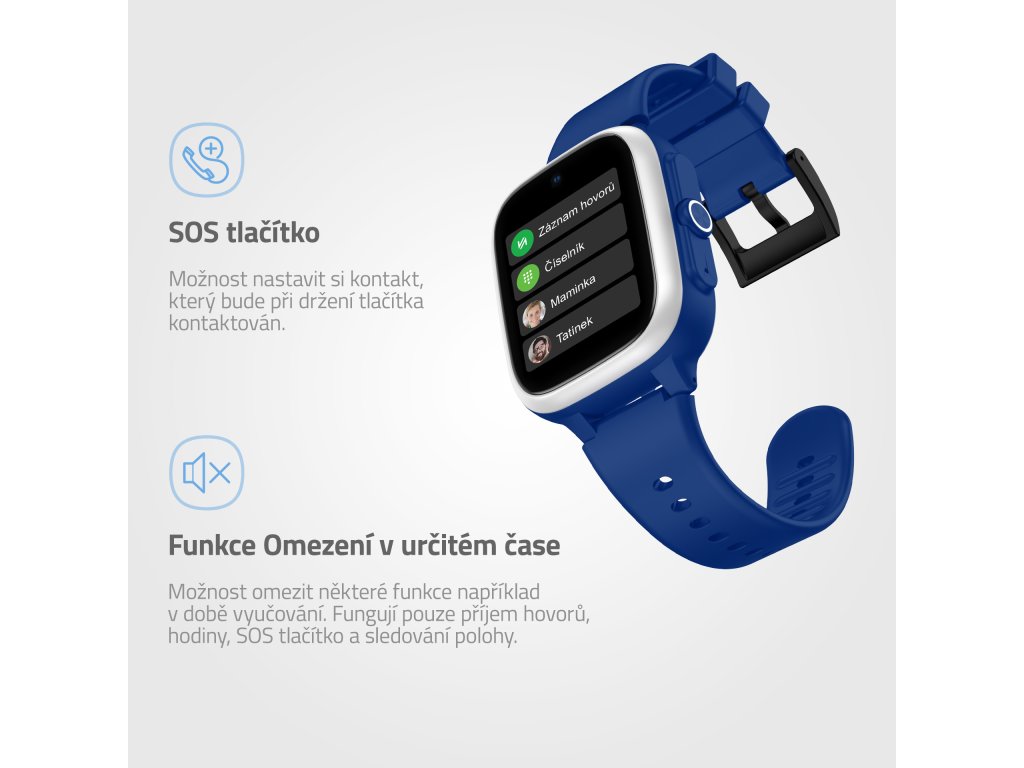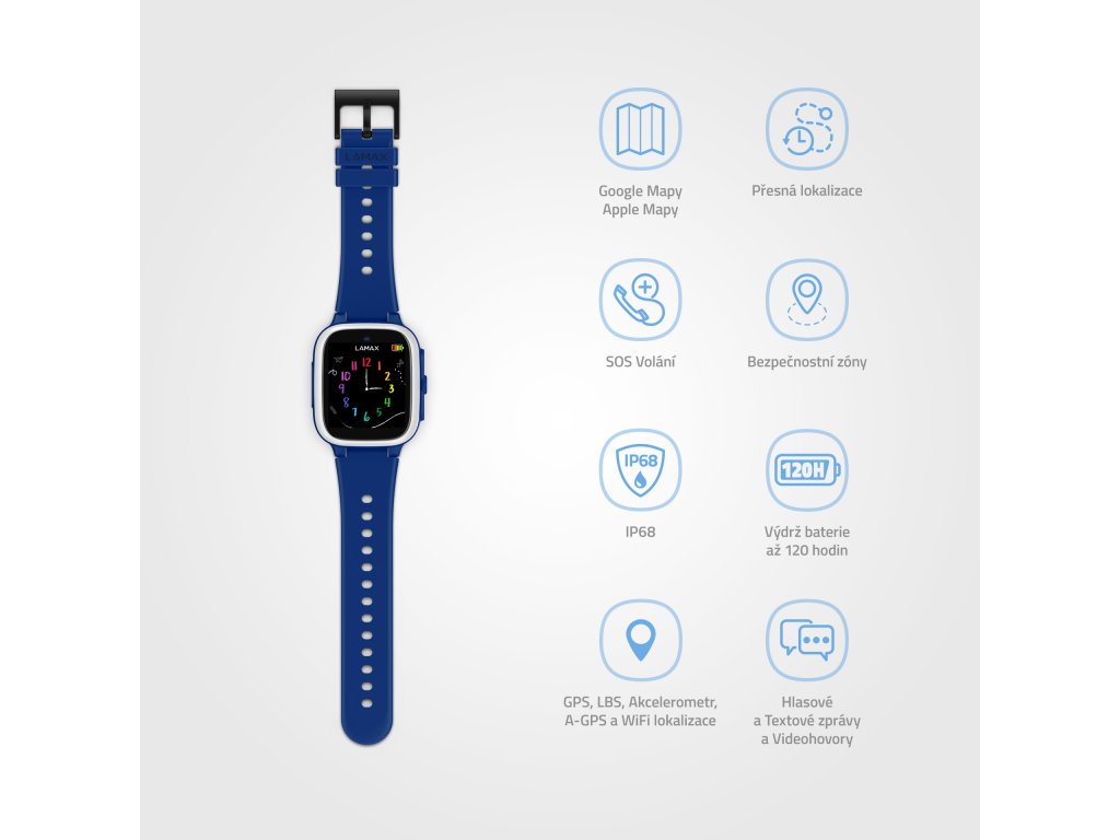 Chytré dětké hodinky, GPS lokalizace, SOS tlačítko, nastavení bezpečných zón, historie volání a polohy, omezení kontaktů, šifrovaný přenos dat, IP68 voděodolnost, výdrž až 120 h, noční režim, krokoměr, modré