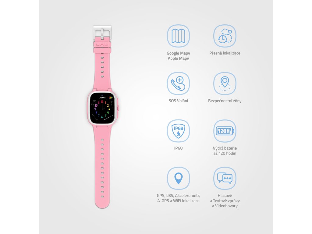 Chytré dětké hodinky, GPS lokalizace, SOS tlačítko, nastavení bezpečných zón, historie volání a polohy, omezení kontaktů, šifrovaný přenos dat, IP68 voděodolnost, výdrž až 120 h, noční režim, krokoměr, růžové