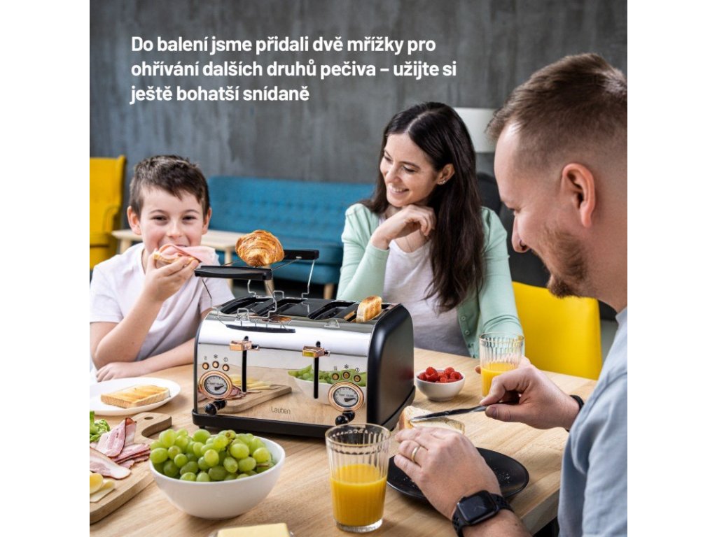 Topinkovač Lauben 4 Slice Toaster 1500BC se skvěle hodí pro rodinné snídaně, jeho 4 sloty umožňují přípravu vícero toastů najednou.