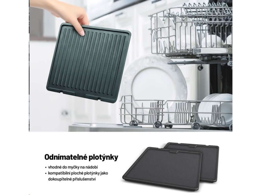 Obě grilovací plotýnky jsou odnímatelné a vhodné do myčky nádobí.