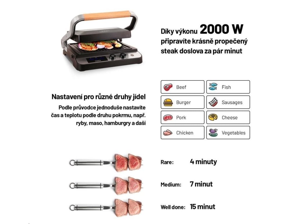 Díky výkonu 2000 W si gril bez problému poradí i s prudkým opečením, které je potřeba u kvalitních steaků, disponuje dostatečnou grilovací plochou 1500 cm2, regulátorem teploty a časovačem.
