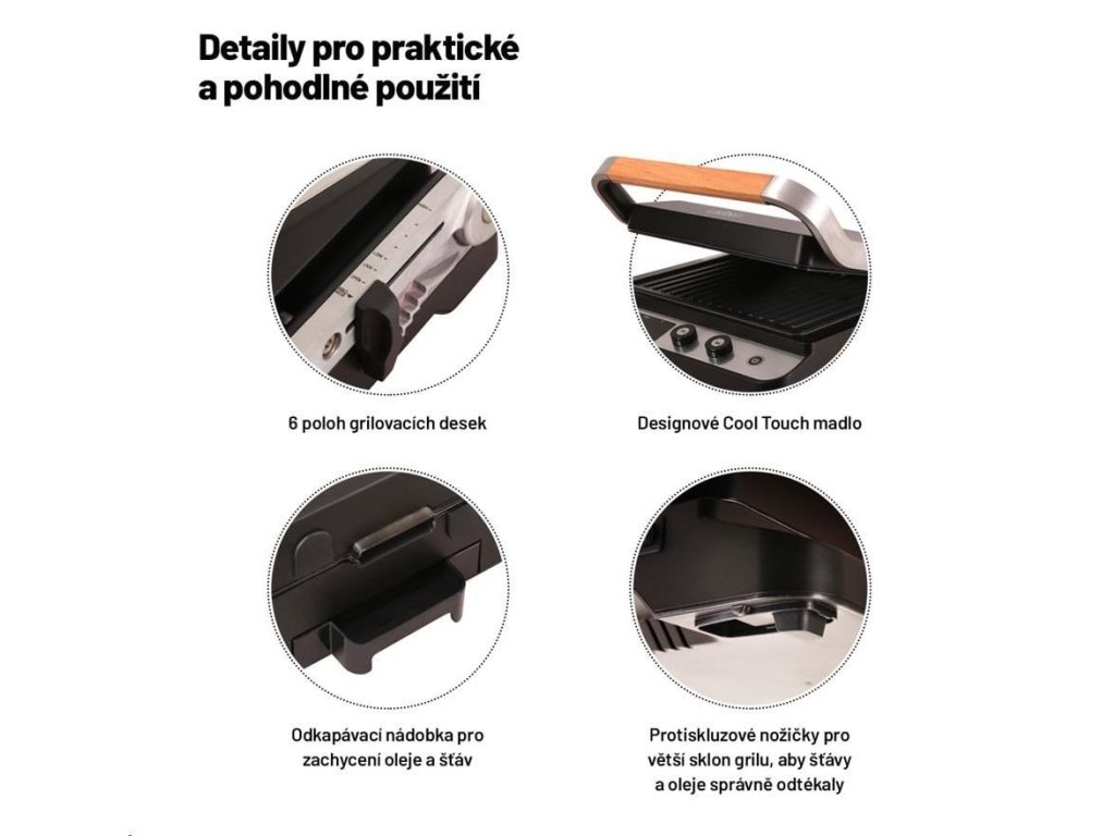Součástí grilu je praktická miska na odkapávání přebytečného tuku a šťávy. Příjemným bonusem je kvalitní designové provedení vhodné do exteriéru i interiéru.